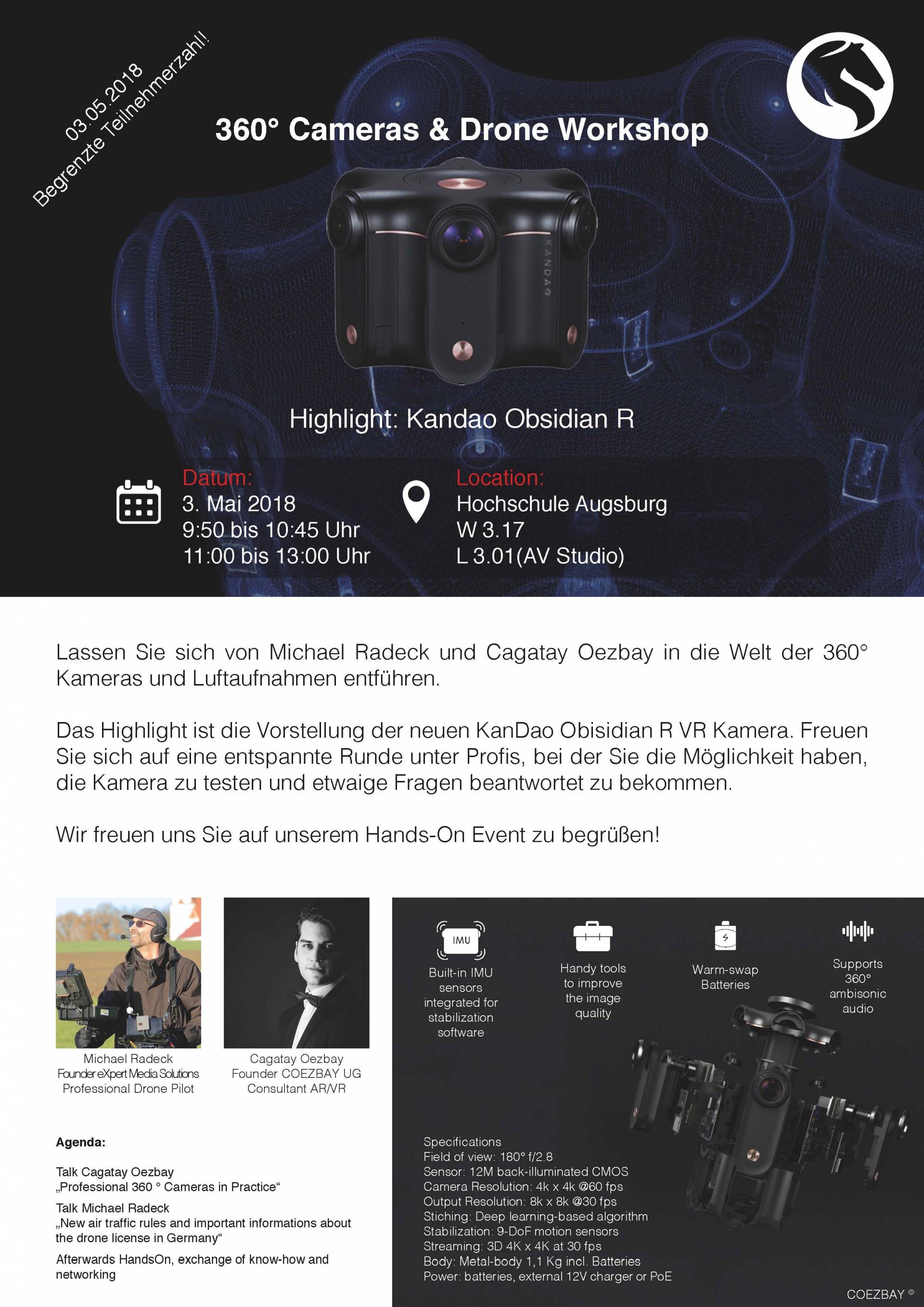 Lassen Sie sich von Michael Radeck und Cagatay Oezbay in die Welt der 360° Kameras und Luftaufnahmen entführen. Das Highlight ist die Vorstellung der neuen KanDao Obisidian R VR Kamera. Freuen Sie sich auf eine entspannte Runde unter Profis, bei der Sie die Möglichkeit haben, die Kamera zu testen und etwaige Fragen beantwortet zu bekommen. Wir freuen uns Sie auf unserem Hands-On Event zu begrüßen!