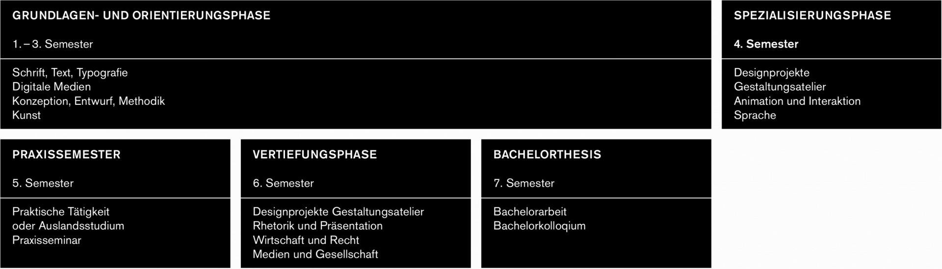 In den ersten drei Semestern werden künstlerisch-gestalterische Fragen thematisiert und grundlegende handwerkliche und technische Fertigkeiten vermittelt. Ab dem vierten Semester werden die erworbenen Grundkenntnisse in unterschiedlichen Fachgebieten praxisorientiert angewandt: