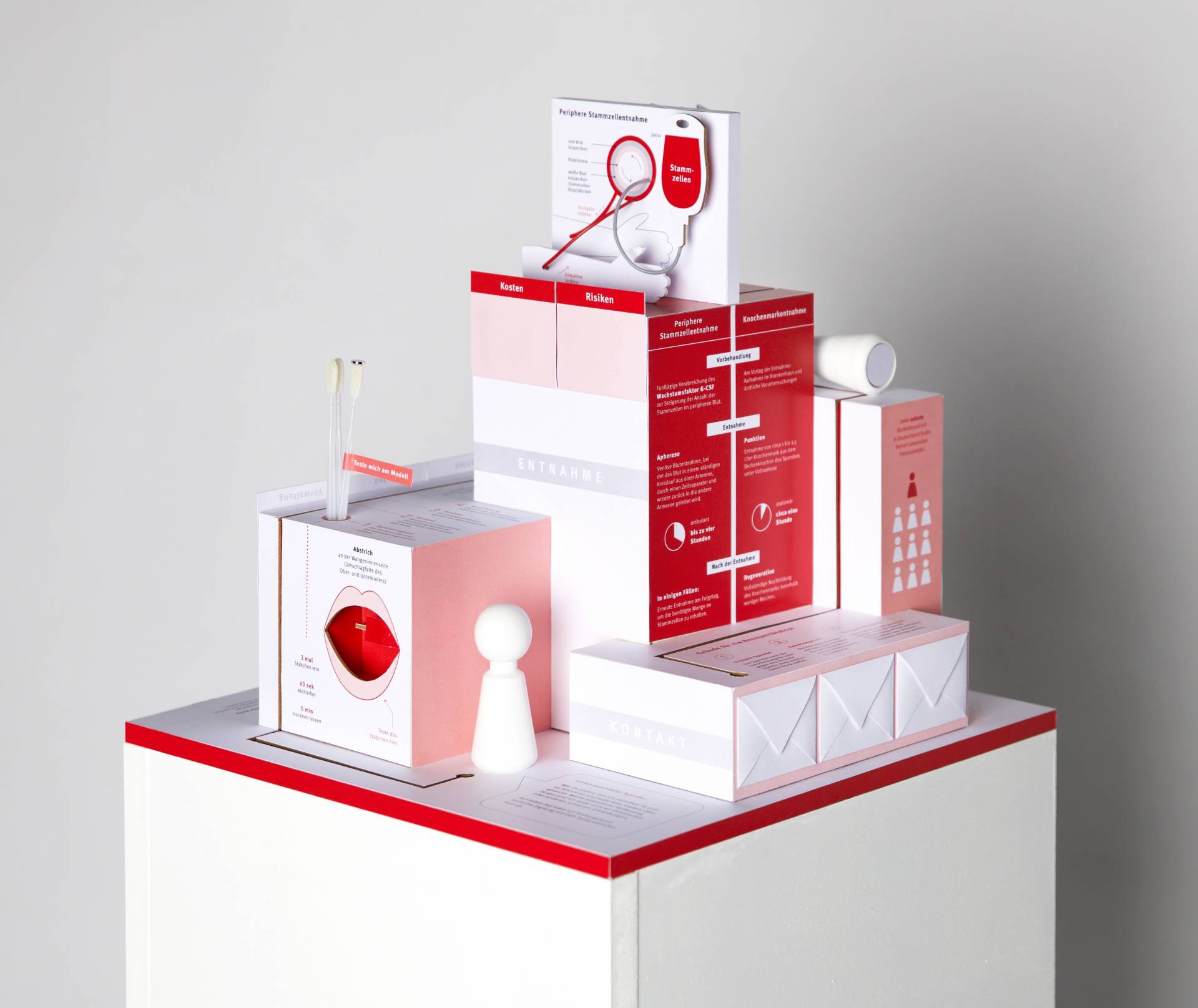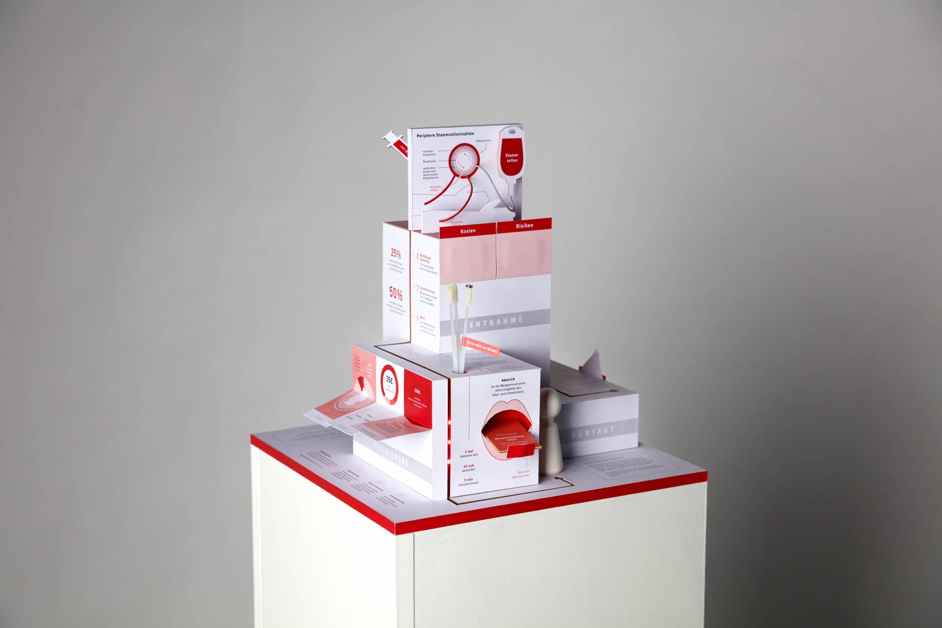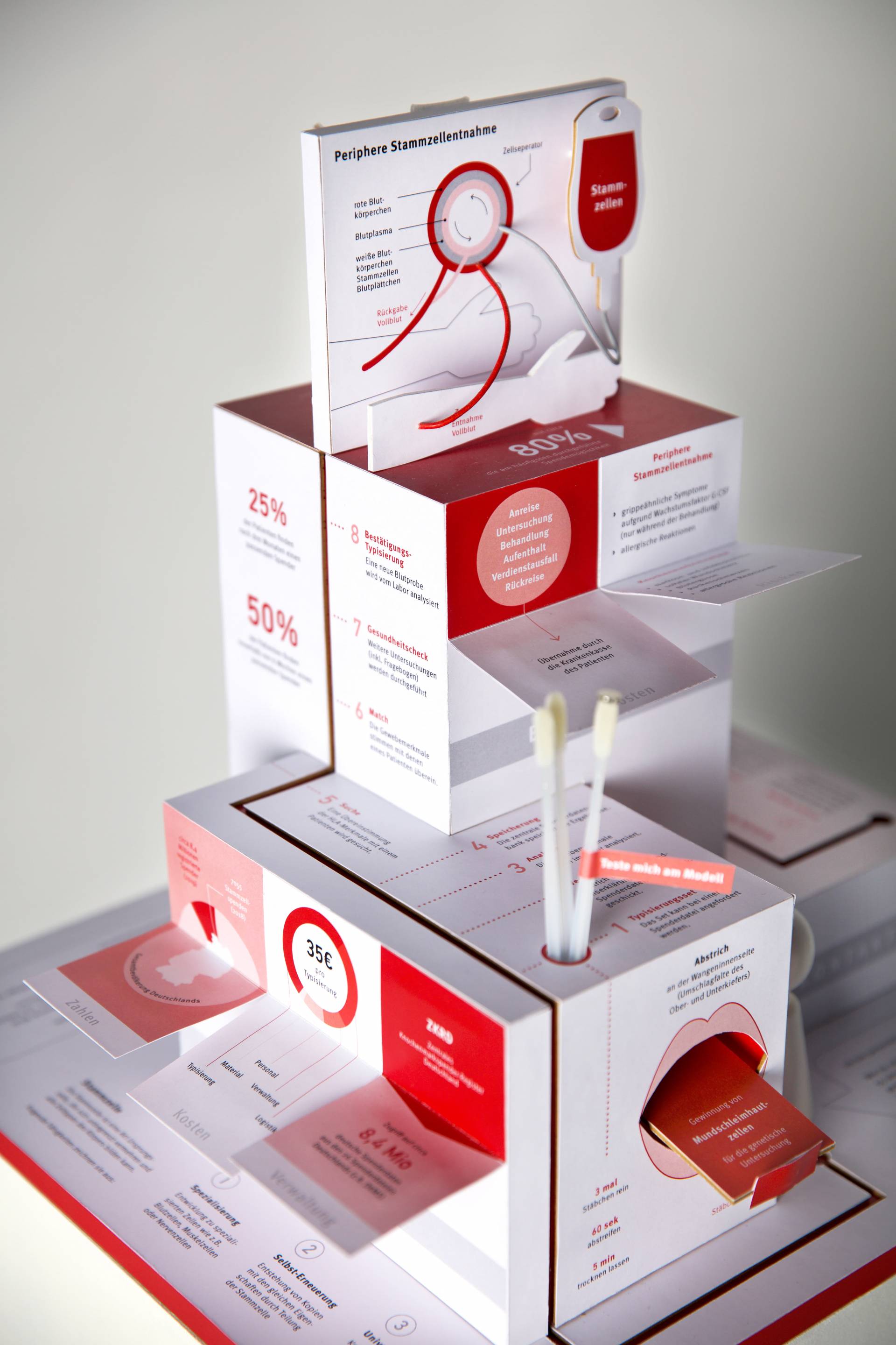 Die 3D-Informationsgrafik ist 30 x 30 x 30 cm groß und bietet eine 360°-Ansicht. Ein LED-Streifen leitet durch die Grafik und zeigt die Reihenfolge des Verfahrens. Beginnend mit einer kurzen Vorstellung eines möglichen Spenders, erklärt die Informationsgrafik den Weg von der Registrierung, über den sogenannten „Stäbchentest“, die Typisierung, mögliche Entnahmearten und die Transplantation, bis hin zur Kontaktaufnahme zwischen Spender und Patient. Julia Pöllmann erklärt: „Mit der Infografik möchte ich Hintergrundinformationen und theoretische Fakten zur Stammzellspende vermitteln. Betrachter haben zusätzlich die Möglichkeit, mit der Grafik zu interagieren: Über einen nachgebildeten Stäbchentest erhalten sie weitere Informationen zum Verfahren.“