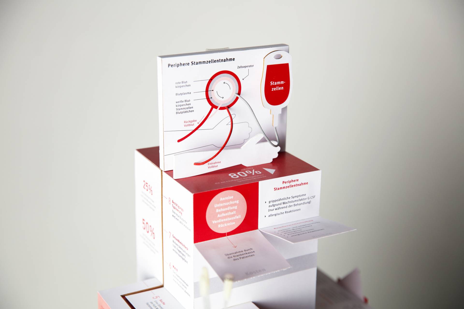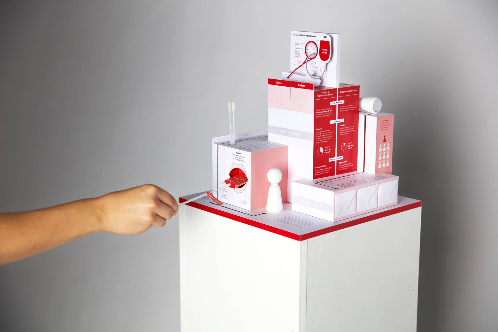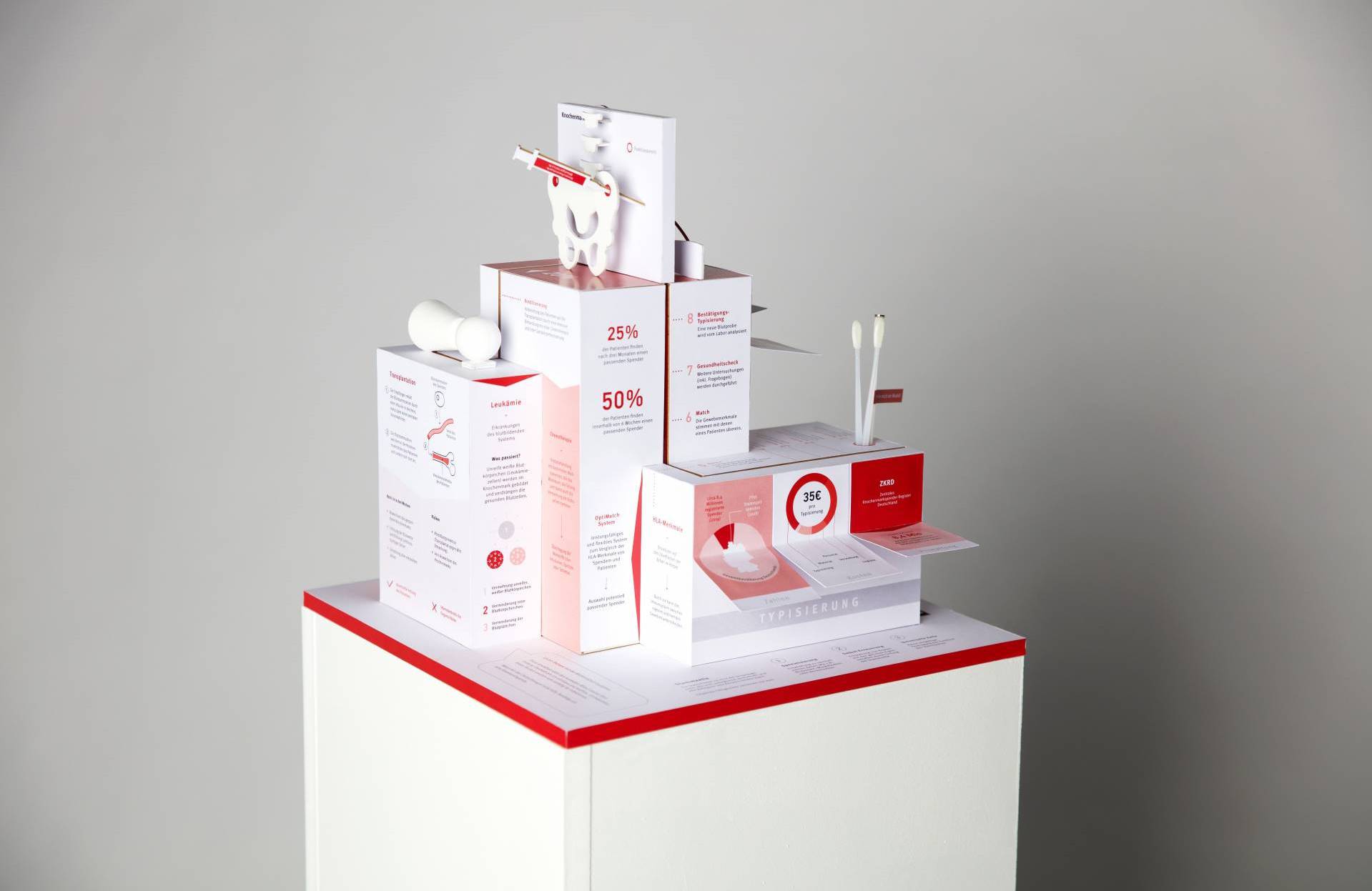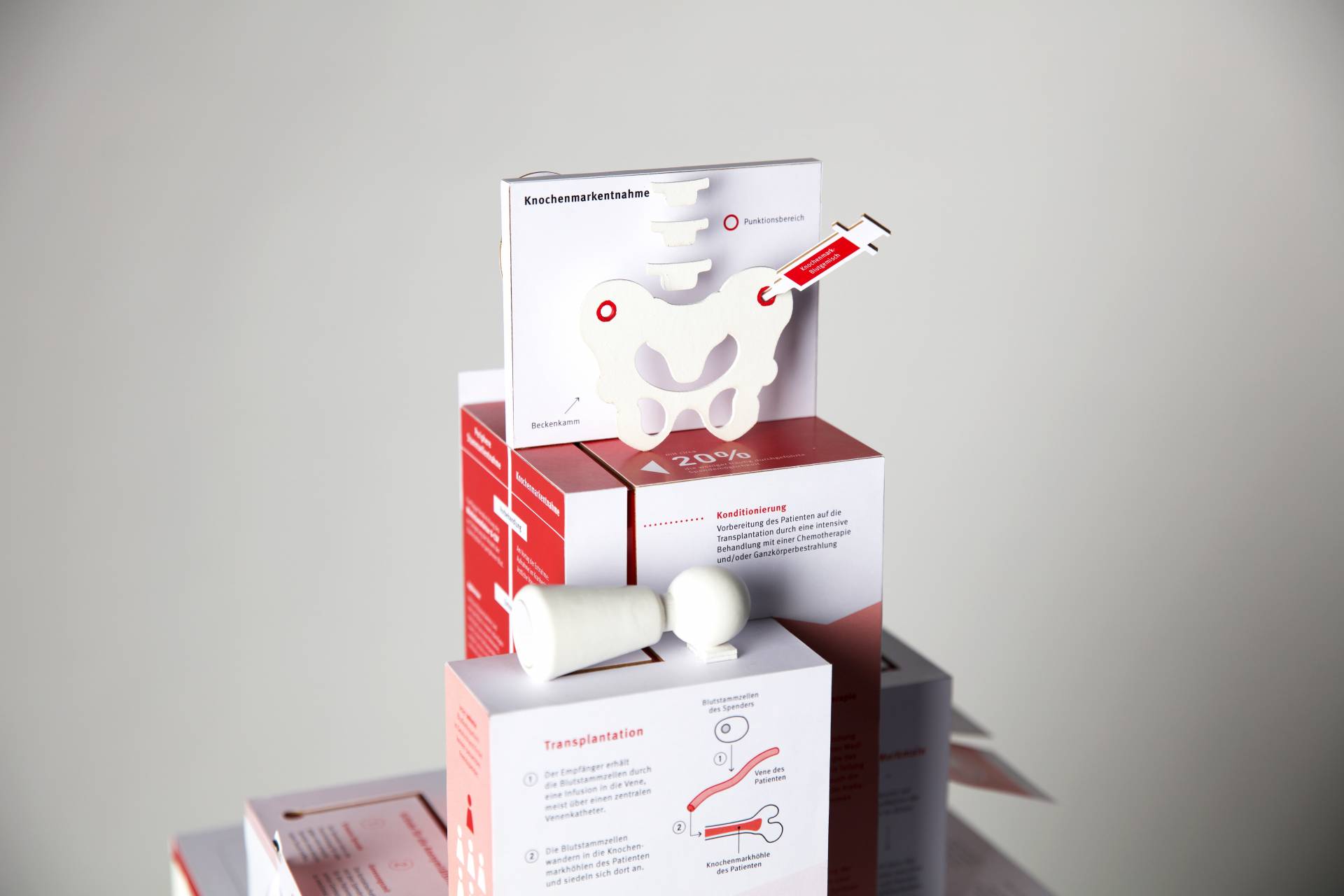 Die 3D-Informationsgrafik ist 30 x 30 x 30 cm groß und bietet eine 360°-Ansicht. Ein LED-Streifen leitet durch die Grafik und zeigt die Reihenfolge des Verfahrens. Beginnend mit einer kurzen Vorstellung eines möglichen Spenders, erklärt die Informationsgrafik den Weg von der Registrierung, über den sogenannten „Stäbchentest“, die Typisierung, mögliche Entnahmearten und die Transplantation, bis hin zur Kontaktaufnahme zwischen Spender und Patient. Julia Pöllmann erklärt: „Mit der Infografik möchte ich Hintergrundinformationen und theoretische Fakten zur Stammzellspende vermitteln. Betrachter haben zusätzlich die Möglichkeit, mit der Grafik zu interagieren: Über einen nachgebildeten Stäbchentest erhalten sie weitere Informationen zum Verfahren.“