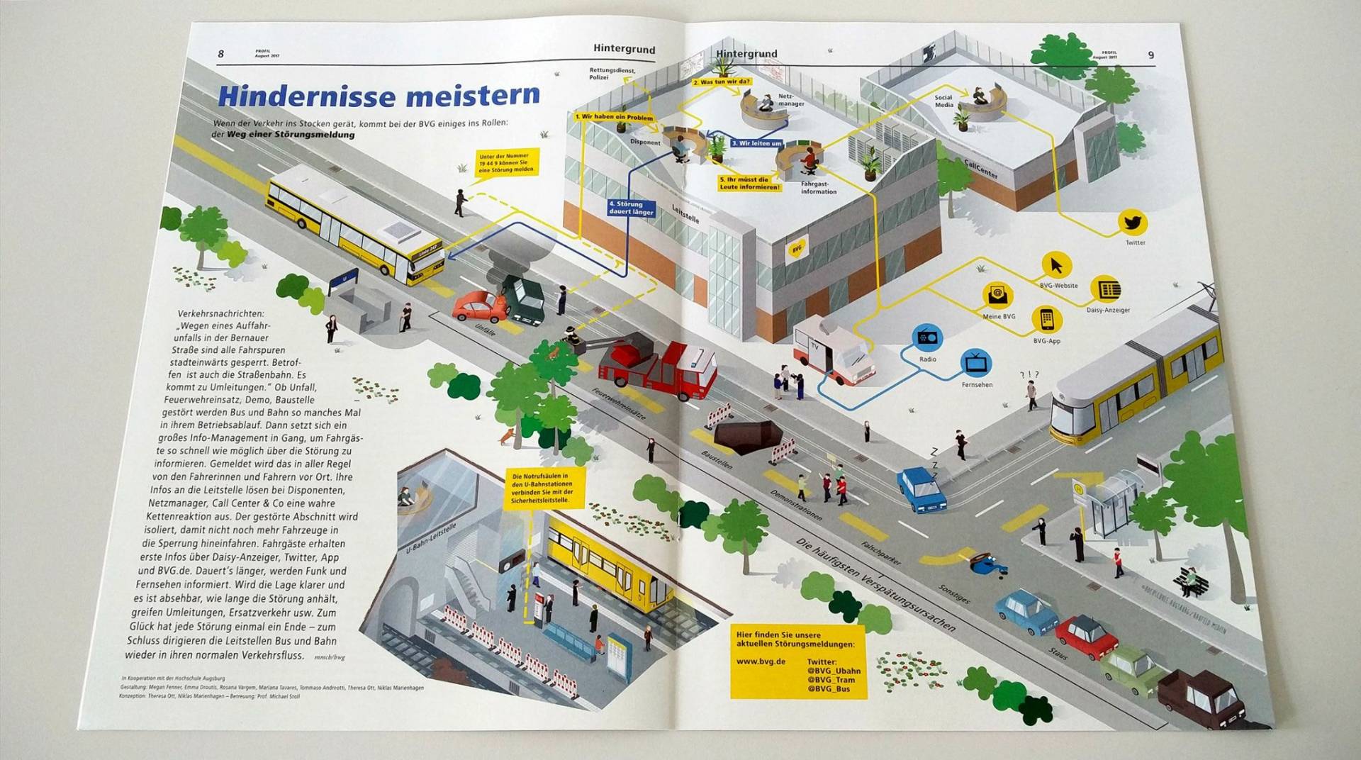 Im Rahmen eines Forschungs- und Entwicklungsauftrags entwickelten Studierende im Sommersemester 2017 eine Infografik für das Kundenmagazin PLUS und die Mitarbeiterzeitung PROFIL der Berliner Verkehrsbetriebe. Den Weg einer sogenannten Störungsmeldung, mit der die BVG-Kunden über Hindernisse informiert werden, galt es, allgemeinverständlich darzustellen und zu erklären.