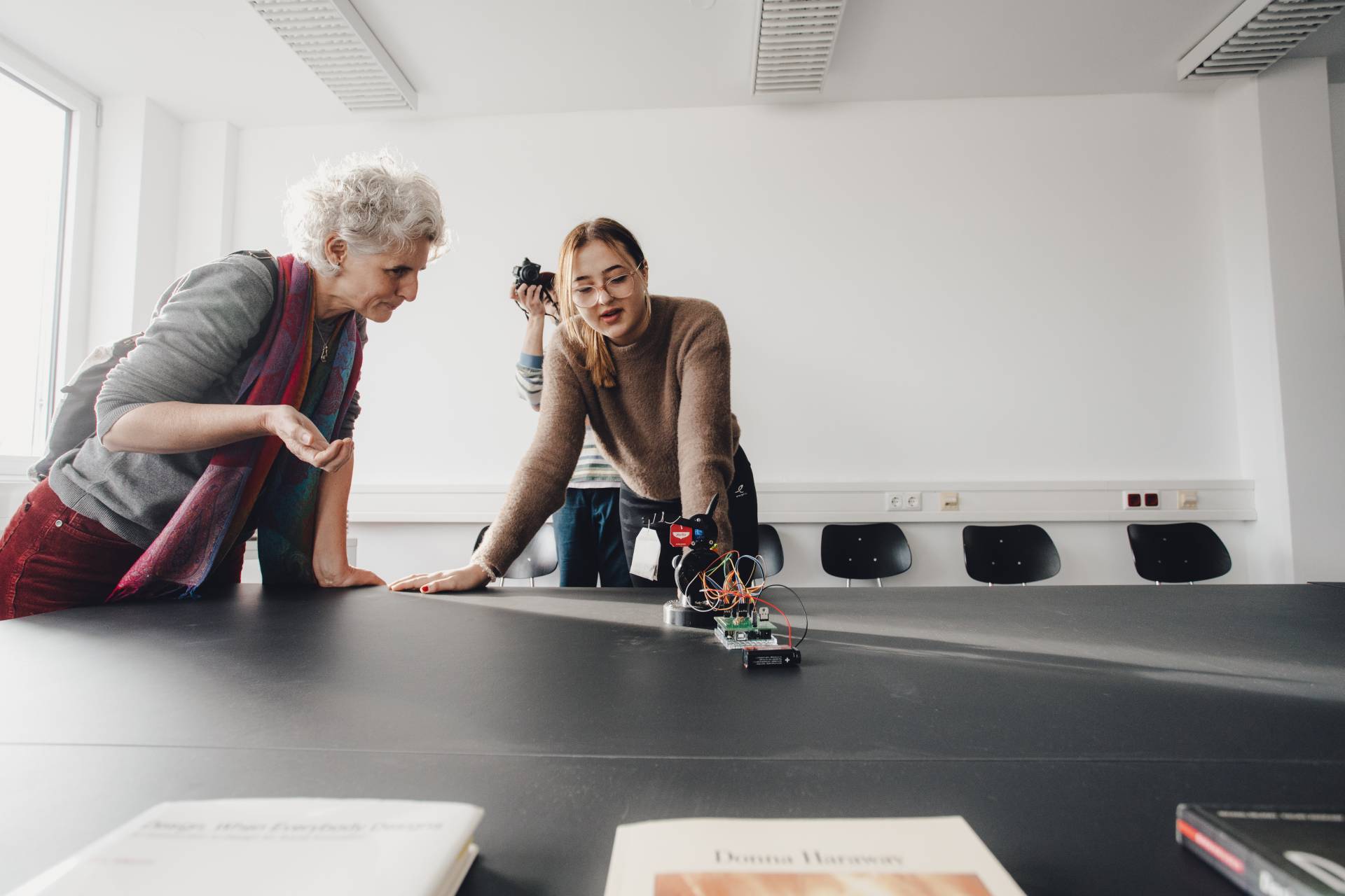 Dass man sich für Lehre und Studium im Makerspace trifft, hat einen Grund. Ziel ist es, über das Machen in einen Prozess der Reflexion zu kommen. „Die Prototypen, die in den Praxismodulen hergestellt werden, sind Denkwerkzeuge“, erklärt Professor Andreas Muxel. Außerdem will man im neuen Studiengang die Wirkhorizonte, in denen gestaltet wird, bewusst größer sehen. Die jeweils betreffenden Zielgruppen und Akteur:innen sollen früh in den Gestaltungsprozess miteinbezogen werden.