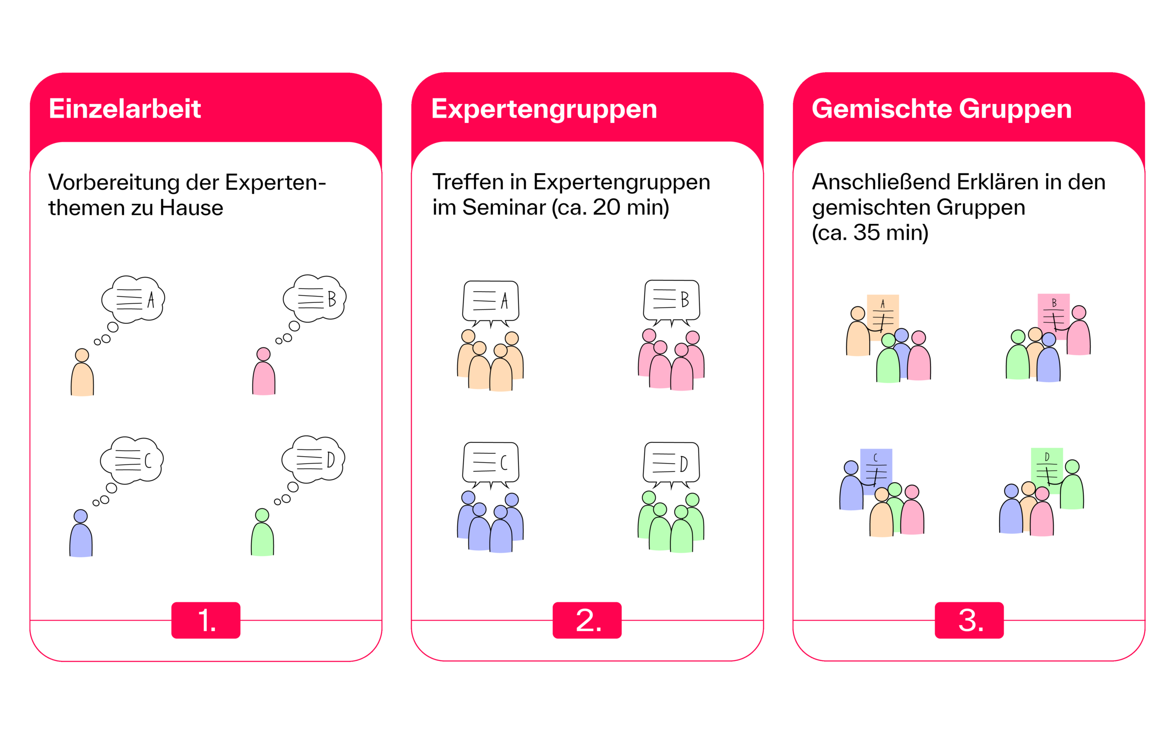 3. Gemischte Gruppen: In der letzten Phase kommen Mitglieder aus den verschiedenen Expertengruppen in neuen, gemischten Gruppen zusammen. Jedes Mitglied erklärt den anderen, was es in der Expertengruppe über das jeweilige Teilthema gelernt hat. Dadurch wird das gesamte Thema durch den Austausch in der Gruppe gemeinsam erarbeitet.