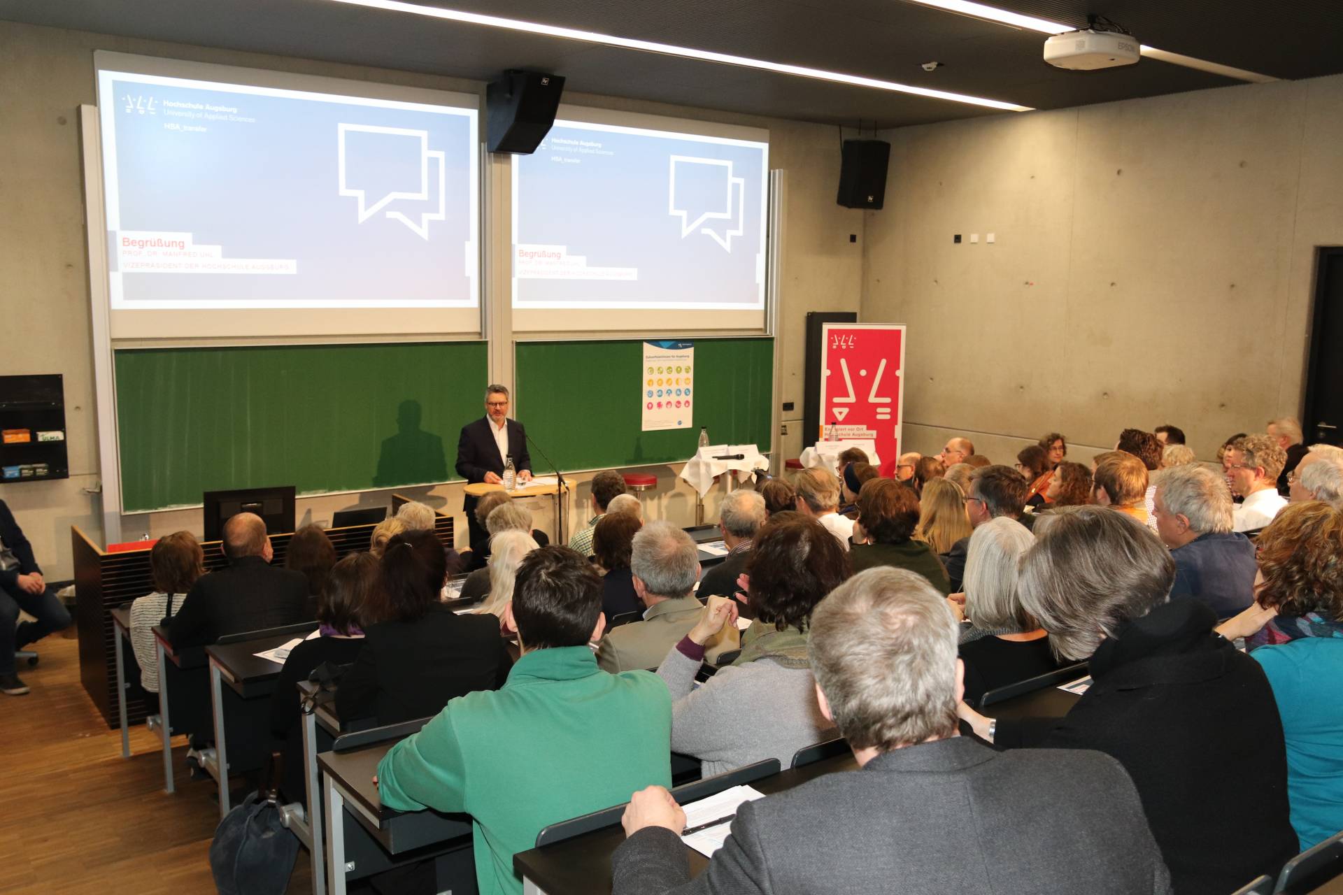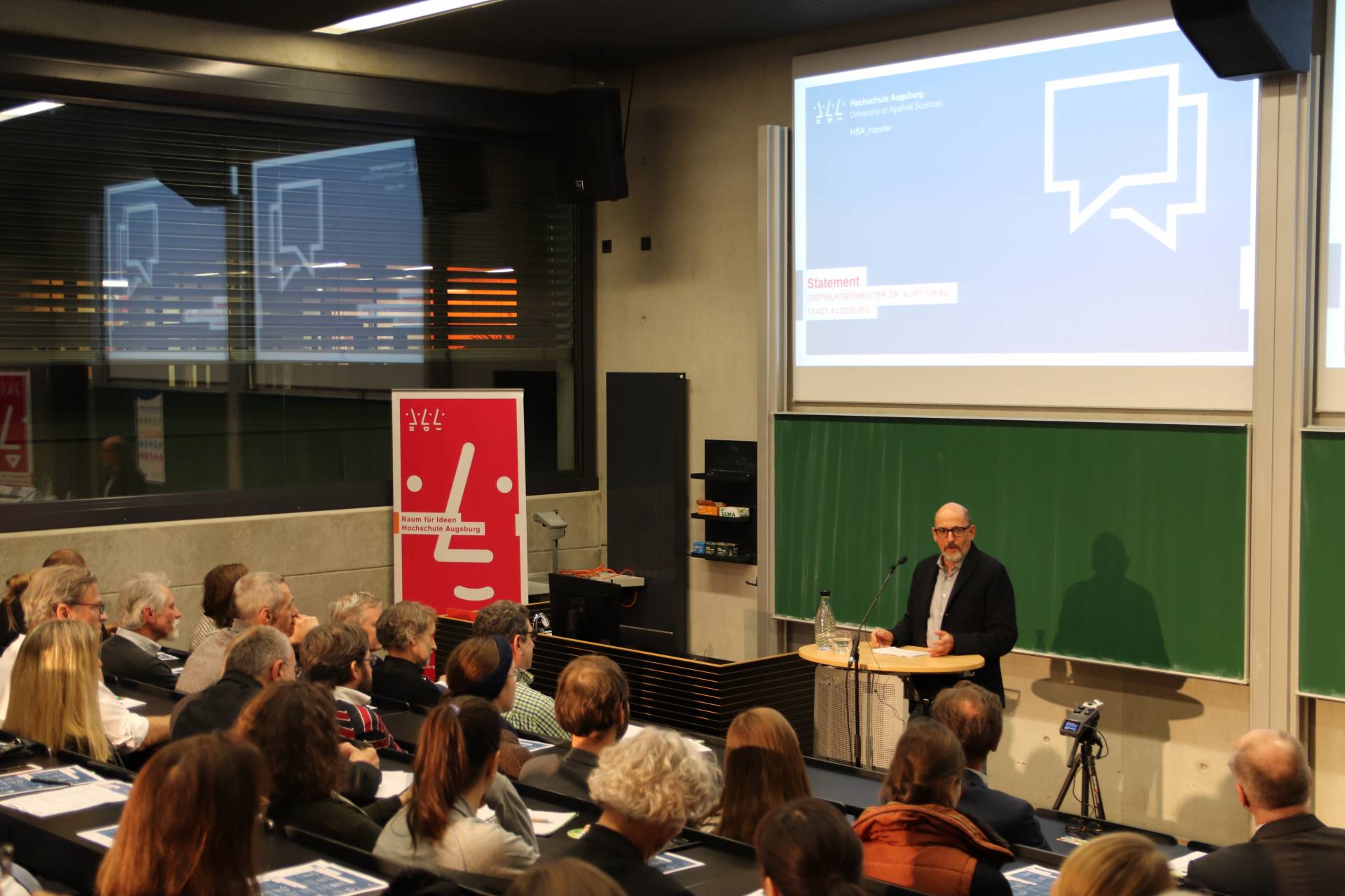 Das Publikum war gut gemischt: Vertreter aus Unternehmen, aus der Kreativbranche, aus sozialen Einrichtungen, aus der Lokalen Agenda 21, aus Umwelt- und Sozialvereinen und vielen anderen Teilen der Augsburger Stadtgesellschaft. Ebenso nahmen Studierende, Professoren und Lehrbeauftragte der Hochschule teil. So zeigte sich, dass die Hochschule den Transfer in einem umfassenden Sinn begreift. Neben Technik und Ökonomie geht es ihr ganz bewusst auch um die Bereiche Kultur, Soziales und Ökologie, also gesellschaftlich relevante Themen. Reiner Erben, Referent für Umwelt, Nachhaltigkeit und Migration der Stadt Augsburg, sagte in seinem Statement: „Nachhaltigkeit braucht eine breite Bewegung. Und das haben wir in Augsburg. Wir freuen uns auf das, was im Rahmen von HSA_transfer entstehen wird. Wir werden von unserer Seite aus alles dafür tun, dass dieses Projekt erfolgreich wird.“