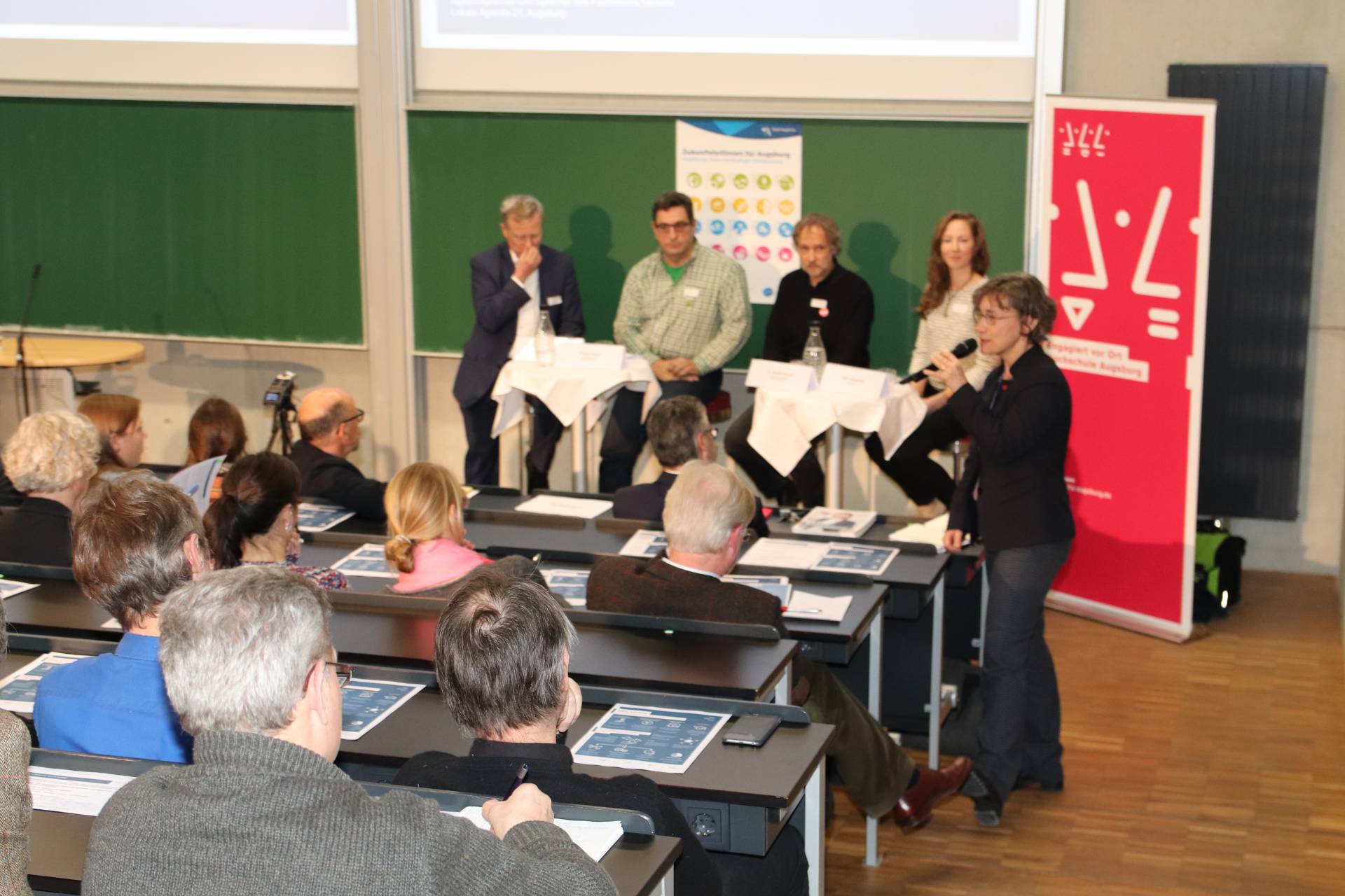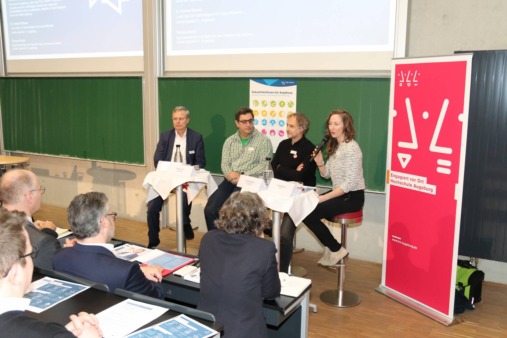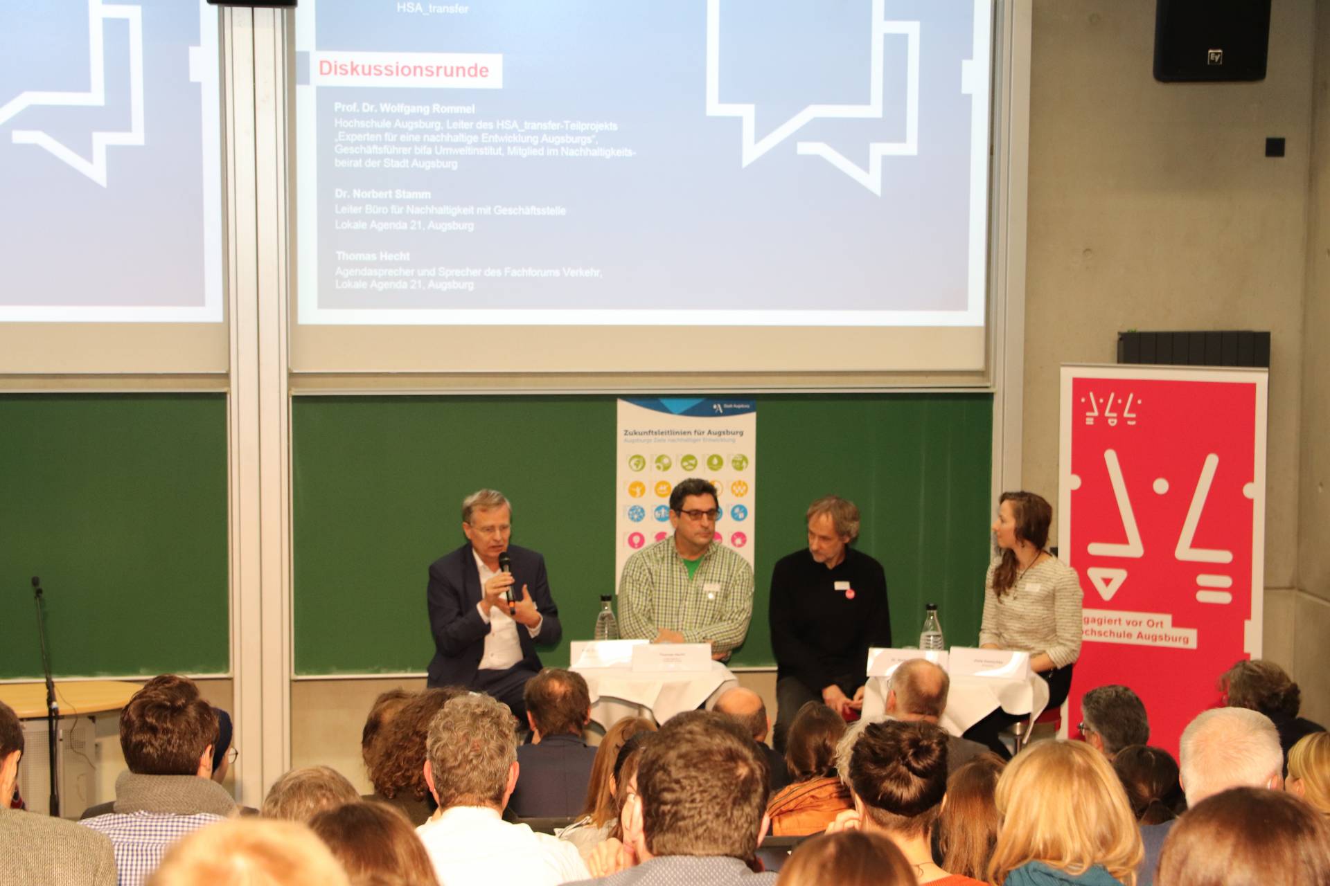 Im Anschluss an die Eingangsstatements begrüßte Moderatorin Viola Zwetschke Prof. Dr. Wolfgang Rommel von der Hochschule Augsburg und Leiter des HSA_transfer-Projekts „Experten für eine nachhaltige Entwicklung Augsburgs“, Dr. Norbert Stamm, Leiter des Büros für Nachhaltigkeit mit der Geschäftsstelle Lokale Agenda 21 Augsburg sowie Thomas Hecht, Agendasprecher und Sprecher des Fachforums Verkehr 21, auf dem Podium.