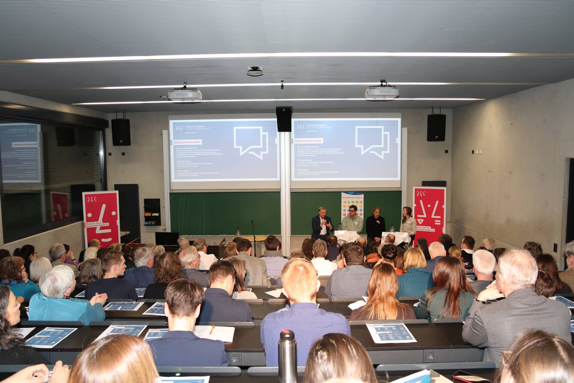 Nachhaltigkeit werde in jeder Disziplin und Fachrichtung und in jedem Verein und Unternehmen anders „gestaltet“, so die Teilnehmer des Talks. Mit dem Thema Nachhaltigkeit werde eine wichtige Debatte angestoßen, in der es nicht um Polarisierungen gehe. Oberbürgermeister Dr. Kurt Gribl sagte: „Wir müssen es schaffen, gemeinsam Lösungen zu suchen. Wir müssen begreifen, dass keiner für sich allein eine Chance hat, Probleme zu lösen.“ Das Regionalitätsprinzip sei schon Ausdruck einer solchen Grundeinstellung. „Vieles kann mit einer regionalen Grundhaltung besser gelöst werden. Darum bin ich froh, dass die Hochschule Augsburg das Regionalitätsprinzip der Agentur HSA_transfer zugrunde gelegt hat“, so der Oberbürgermeister der Stadt Augsburg.