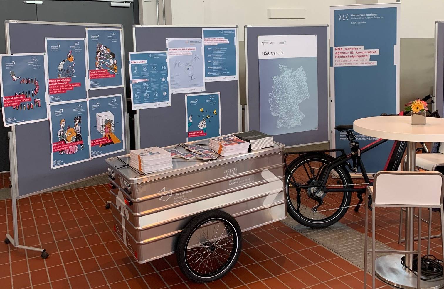Im Mittelpunkt stand die Vorstellung des Projekts HSA_transfer, die Erläuterung des Transferverständnisses der Hochschule Augsburg sowie die Präsentation der im Förderzeitraum erzielten Transferergebnisse. Highlight am Stand war HSA_transmitter | mobil – das E-Bike mit Anhänger, das für Transferaktivitäten außerhalb der Hochschule zum Einsatz kommt. Verteilt wurden auch die von HSA_transfer konzipierten Publikationen gP Transfer 2019, gP Transfer 2022 und gP Impulse sowie eine Transfer-Postkarten-Serie.