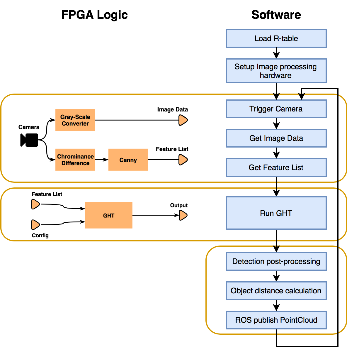 Für die Erkennung wird das Verfahren der Hough-Transformation verwendet. Dieses gilt als sehr robust, aber auch als sehr rechenaufwendig. Durch die an der Hochschule Augsburg entwickelte Spezialhardware konnte dieser Prozess erheblich beschleunigt werden, sodass die eigentliche Objektsuche nur noch wenige Millisekunden benötigt. Softwareseitig werden die Erkennungen plausibilisiert und aus der Kamera-Perspektive für den Aufbau einer Karte transformiert. Die letztendliche Gesamtverarbeitung ist damit schneller als die Bildaufnahme einer gängigen 30-FPS-Kamera!
