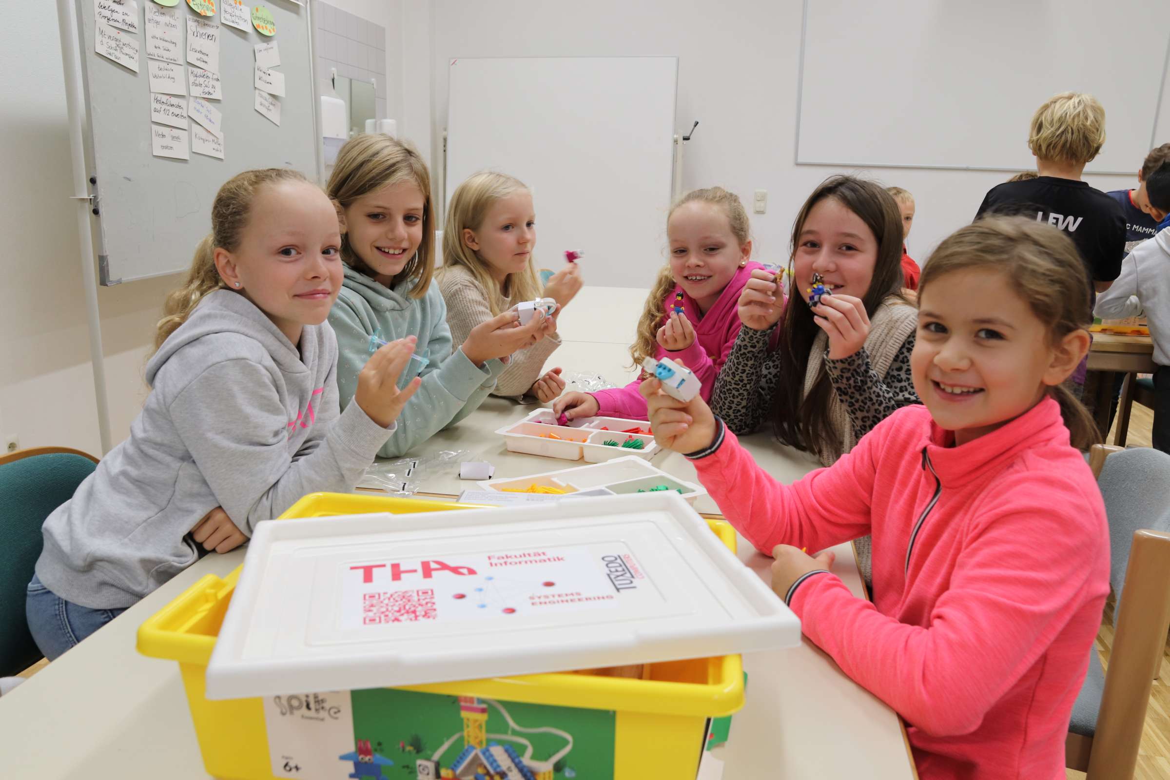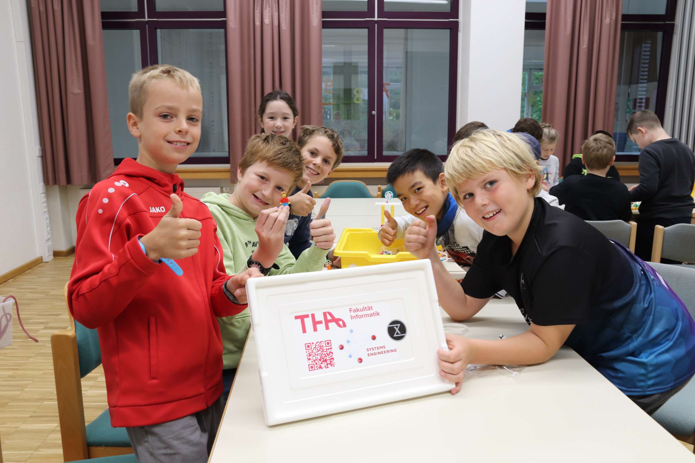 Die Schülerinnen und Schüler durften das Material unmittelbar ausprobieren. In der AG werden die teilnehmenden Kinder in den kommenden Monaten lernen und vor allem erfahren, wie man konzipiert, programmiert, konstruiert und testet. Prof. Wanninger erklärte: „Mit einer spielerischen Heranführung an MINT-Themen kann nicht früh genug begonnen werden, denn insbesondere in sehr jungen Jahren werden Kinder, je nach familiärem Hintergrund, in dieser Hinsicht unterschiedlich stark gefördert.“ Aus diesem Grund sind Prof. Wanninger und Prof. Kirchmeier mit ihrem Team aus dem Verbundprojekt „Digital und Regional“ regelmäßig an Schulen in Bayerisch-Schwaben zu Gast und versuchen, mit Vorträgen und gemeinsamen Projekten, Begeisterung für MINT-Fächer bei Schülerinnen und Schülern zu wecken.