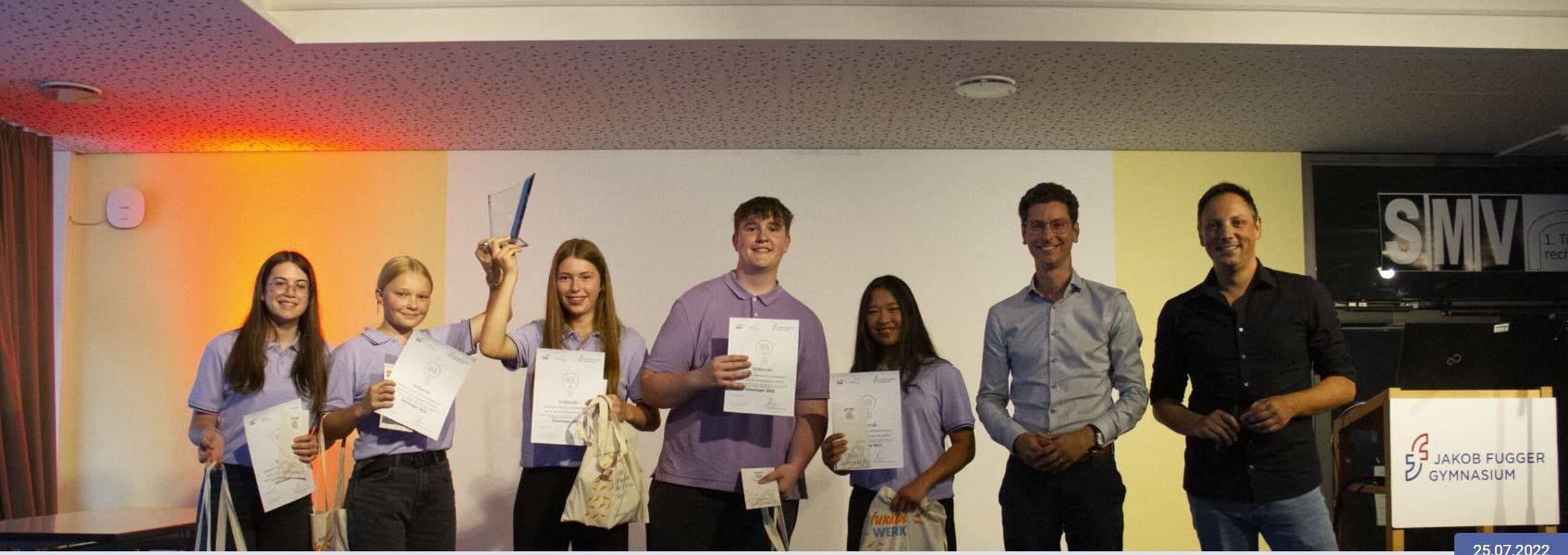 An der abschließenden Live-Abstimmung nahmen über 100 Leute des Publikums teil und es gewann eindeutig das Unternehmen Smervice, bestehend aus den Schülerinnen Karolina Dinh, Mia Kramer, Charlotte Groschupp, Luna Giunta und dem Schüler Samuel Tilk. Alle erhielten einen 20€-Gutschein der FairTrade-Schülerfirma, eine Siegerurkunde und einen Wanderpokal, der an die nächstjährigen Gewinner weitergereicht wird. Zudem wurden Ihnen Preise von Herrn Prof. Dr. Zimmermann überreicht, die freundlicherweise vom Funkenwerk der Hochschule Augsburg zur Verfügung gestellt wurden. Alle drei Start-ups erhalten zudem Freikarten für die Veranstaltung „Augsburg gründet“ am 16. November 2022.