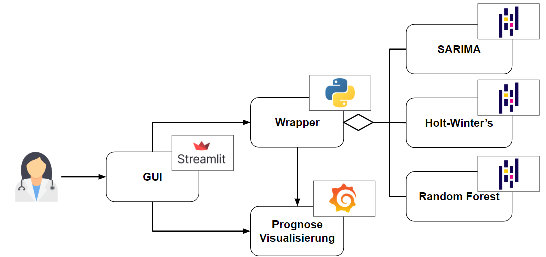 In Kooperation mit der XITASO GmbH wurde eine Anwendung entwickelt, die mithilfe von Machine Learning das Patientenaufkommen vorhersagt und visualisiert, um die Pflegepersonaleinsatzplanung zu verbessern. Basierend auf historischen Daten wird das Verfahren der Zeitreihenprognose verwendet, wobei Modelle wie Random Forest, SARIMA und Holts Winters seasonal method zum Einsatz kommen. Die Modellgüte wird durch RMSE, MAPE und MAE bewertet. Die Vorhersagen werden in einer benutzerfreundlichen Weboberfläche dargestellt, die es Pflegeeinrichtungen ermöglicht, die Personalplanung bedarfsgerecht zu optimieren.