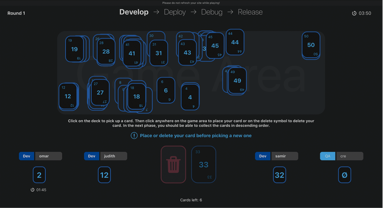 In der Develop-Phase müssen alle Karten vom Stapel in möglichst kurzer Zeit auf der Game Area platziert werden. Eine gelegte Karte darf nicht mehr angefasst werden, so wie auch ein fertiges Feature in der Programmierung oft nicht mehr bearbeitet wird. Da jede Funktion nur einmal existieren darf, sollen Dubletten entfernt werden.
