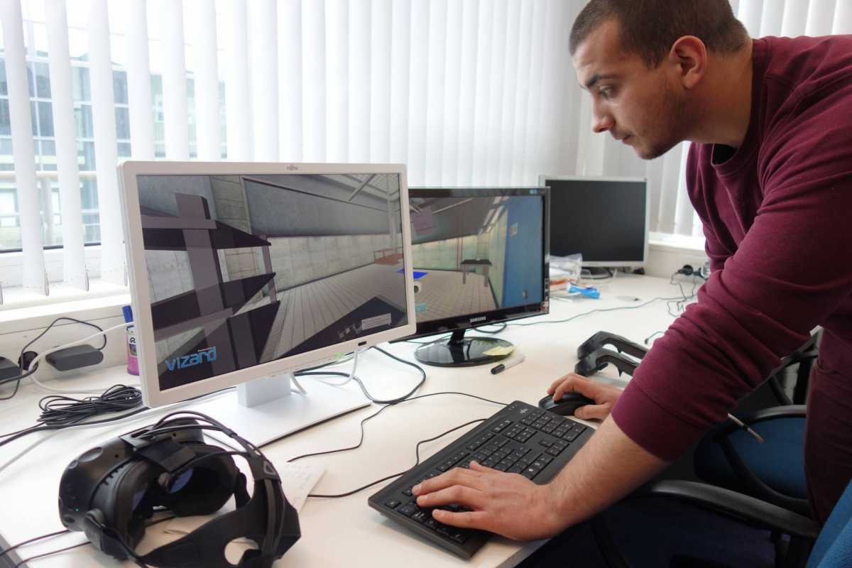 Bei der Anwendung handelt es sich um eine Virtual-Reality (VR) Simulation, bei der mit Hilfe einer VR-Brille und eines VibroTac-Armbands die Montage eines KUKA-Roboters trainiert werden kann. In einer virtuellen Montagezelle können Objekte gegriffen, positioniert und montiert werden. Dabei erzeugt das Armband eine wahrnehmbare (haptische) Rückmeldung. Im Rahmen des Projekts wurde dafür eine Trainingssoftware entwickelt. Auf diese Weise kann der Montagevorgang analysiert und optimiert werden. Ebenso lassen sich z.B. ‚Anfängerfehler‘ vermeiden und Risiken senken, wenn man die Montage vor der realen Ausführung in einer Simulation übt. Das Projekt wurde in Zusammenarbeit mit der Firma KUKA Roboter GmbH durchgeführt. Es wurde erfolgreich im Wintersemester 2017/18 weitergeführt und soll im kommenden Sommersemester 2018 um den Aspekt Avatare in der virtuellen Realität erweitert werden.