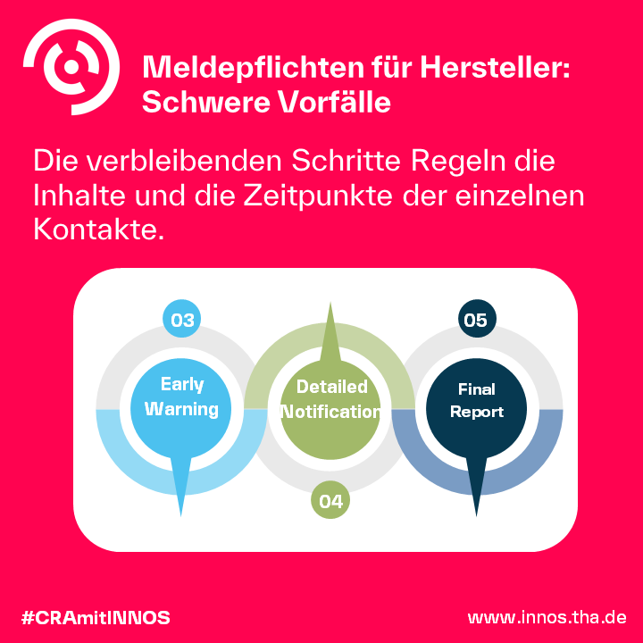 Die Meldung erfolgt dann über eine Plattform direkt an das CSIRT (in Deutschland: CERT BUND) und die ENISA. Die verbleibenden Schritte Regeln die Inhalte und die Zeitpunkte der einzelnen Kontakte.