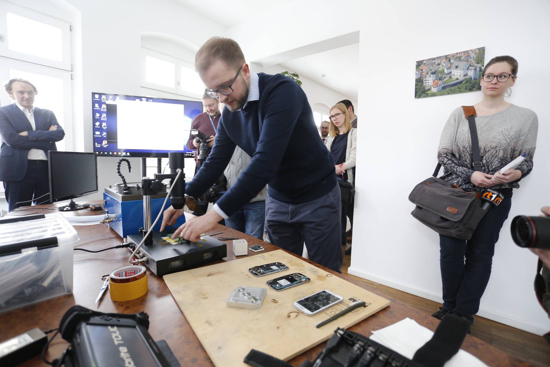 Wie die Datenauslese bei einem Smartphone aussieht, wenn beispielsweise die üblichen Schnittstellen wie Bluetooth oder USB zerstört sind, erklärte anschließend Peter Schulik, wissenschaftlicher Mitarbeiter am Institut HSA_innos. Gemeinsam mit seinem Team arbeitet er an fortgeschrittenen Methoden und Techniken, die Daten von Smartphones und Smart Devices auszulesen und zu rekonstruieren. „Mobile Endgeräte werden immer komplexer. Die traditionellen Verfahren zur Sicherung und Auswertung von digitalen Spuren stoßen langsam an ihre Grenzen“, erklärt Schulik. So demonstrierte er beispielsweise bei dem Pressetermin ein sogenanntes nicht thermisches Chip-Off-Verfahren: Der wärmeempfindliche Speicherbaustein wird mit einer Fräse und einer Schleifmaschine vorsichtig aus dem Smartphone gelöst, bevor die Rekonstruktion des Speicherabbildes erfolgen und die Analyse der Inhalte stattfinden kann.