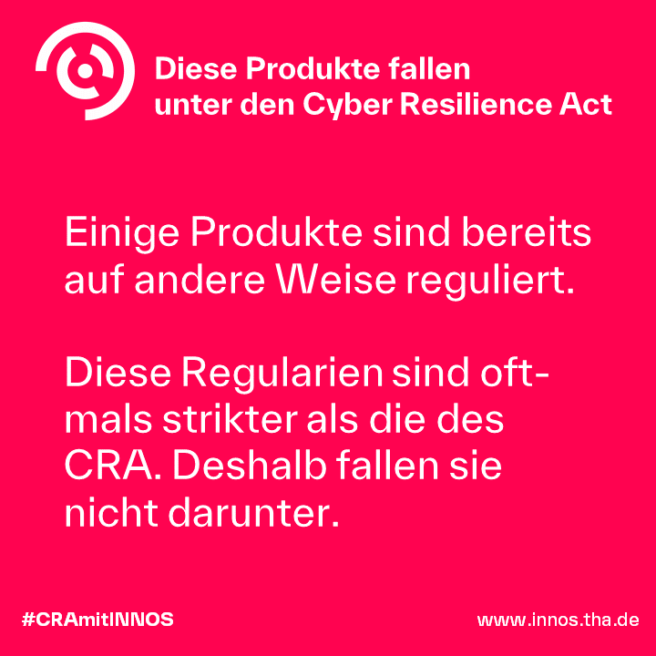 Einige Produkte sind bereits auf andere Weise reguliert. Diese Regularien sind oftmals strikter als die des CRA. Deshalb fallen sie nicht darunter. Diese sind in der zweiten Grafik gelistet.