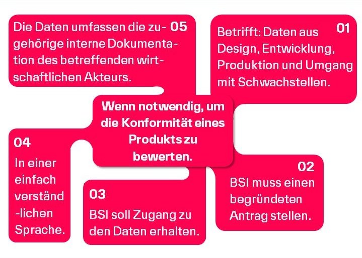 Das betriff Daten aus dem Design, der Entwicklung, der Produktion und dem Umgang mit Schwachstellen. BSI muss hierfür einen begründeten Antrag stellen. Daraufhin soll es Zugang zu den Daten in einer einfach verständlichen Sprache erhalten. Und müssen die zugehörige interne Dokumentation des betreffenden wirtschaftlichen Akteurs umfassen.
