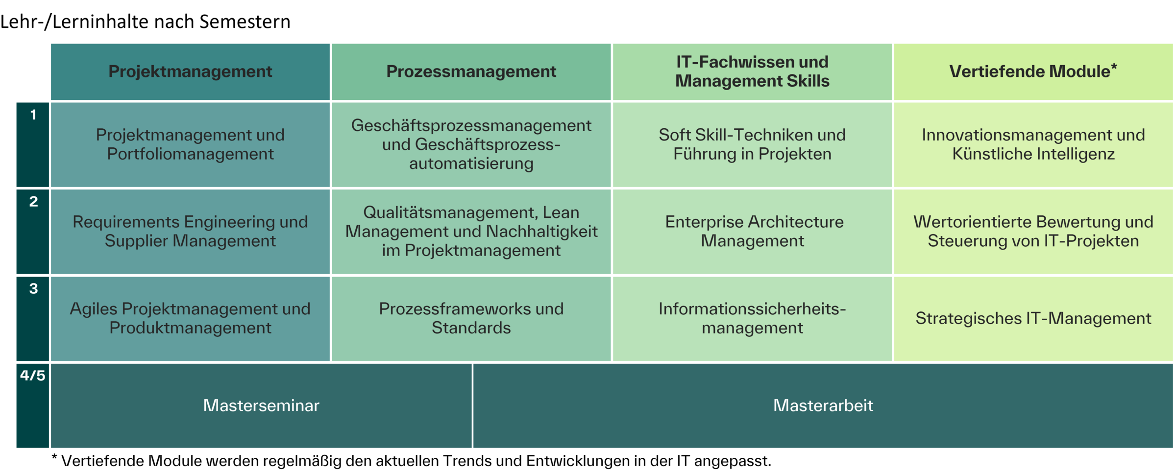 Der Master vermittelt praxisnahes Wissen in den Bereichen Projektmanagement, Prozessmanagement, IT-Fachwissen mit Management Skills sowie vertiefende Module. Abgerundet wird er durch ein Masterseminar und die Masterarbeit. Durch die breite fachliche und branchenspezifische Vielfalt der Teilnehmenden ergeben sich wertvolle Anknüpfungspunkte für Praxisprojekte, Kooperationen und berufliche Perspektiven.