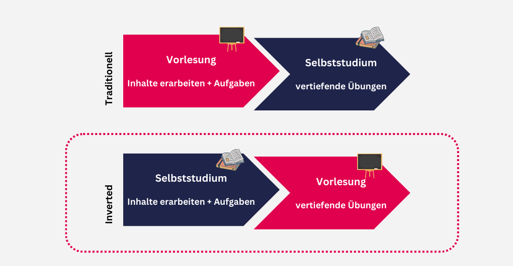 Der Inverted Classroom (= Flipped Classroom) kehrt das traditionelle Unterrichtsmodell um. Anstatt neue Inhalte in der Vorlesung zu erarbeiten, bereiten sich die Studierenden eigenständig mit Lehrvideos, Artikeln und aktivierenden Übungen vor. Der Präsenzunterricht wird dann für vertiefende Diskussionen, Gruppenarbeiten und individuelle Betreuung genutzt. So wird die wertvolle Unterrichtszeit optimal für die Förderung des Verständnisses und der Anwendung genutzt.