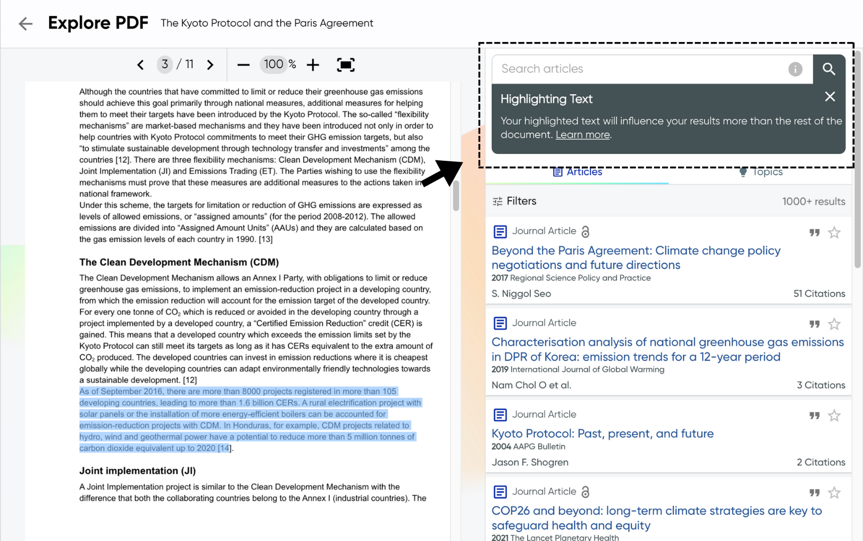 - Text Highlighting – Fokussierte Suche: Durch das Markieren spezifischer Textabschnitte kann Keenious die Suche auf diese Bereiche konzentrieren, was zu präziseren Ergebnissen führt.