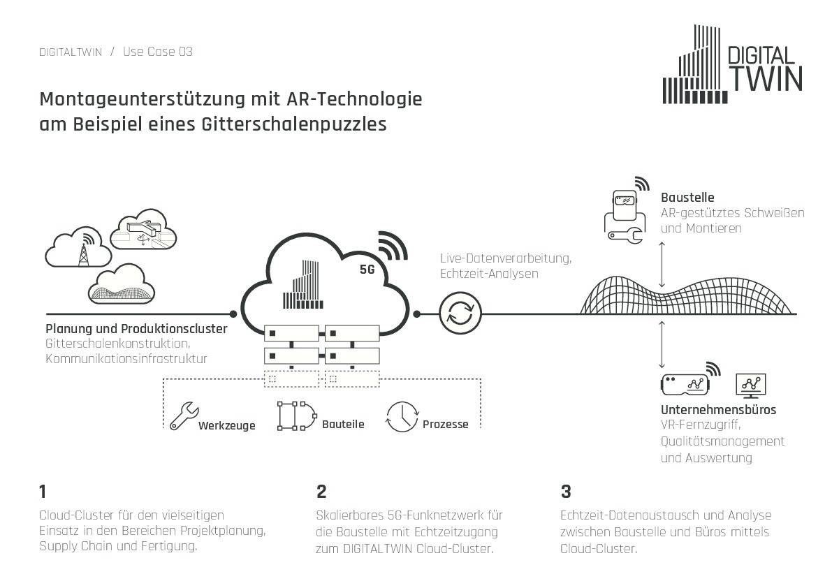 Die offene Plattformarchitektur, weiterentwickelte Breitbandkommunikationstechnologie und Computer Vision Technologien sollen ferner die Planung, Fertigung und Abstimmung mit der Baustelle vereinfachen und den Anwendern eine vertrauenswürdige und flexibel erweiterbare Kommunikations- und Administrations-Infrastruktur zur Verfügung stellen. Ziel von DigitalTWIN ist es, die Schnittstellen zwischen Planung, Fertigung, Montage, Betrieb sowie Rückbau durch IT-gestützte Werkzeuge zu verbessern bzw. überhaupt erst zu schaffen.