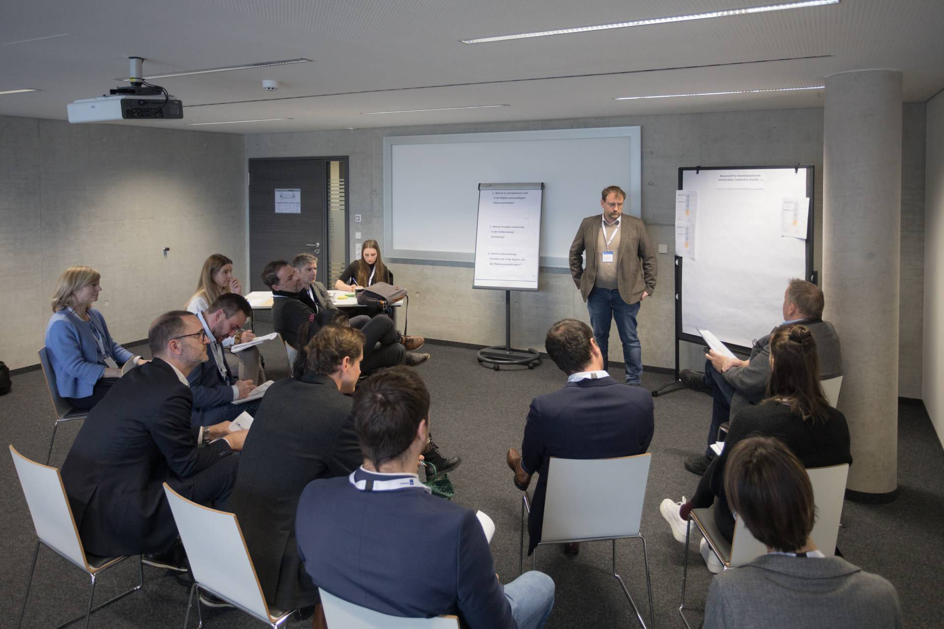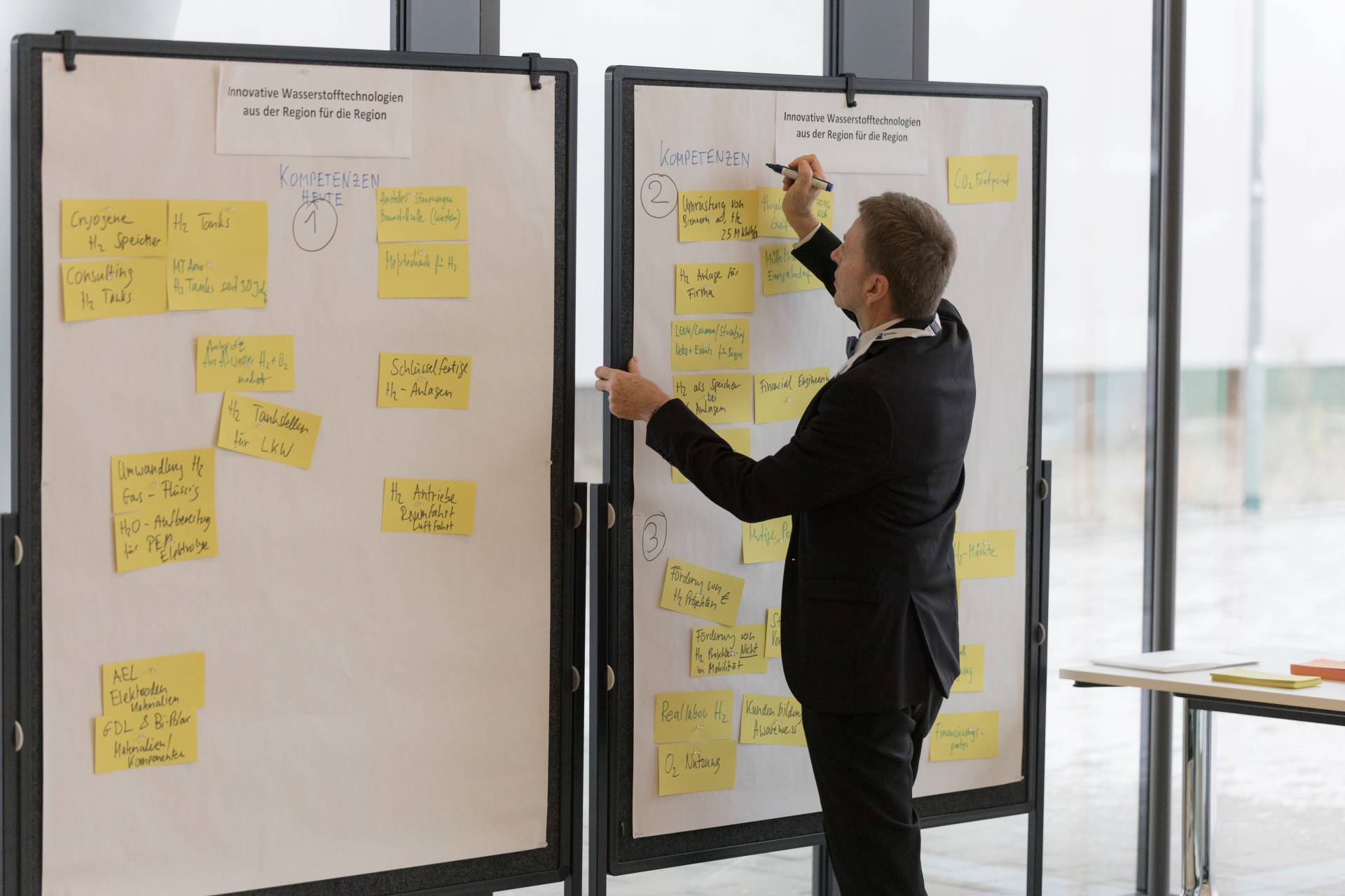 Im Anschluss daran organisierten sich die Teilnehmenden an fünf Thementischen, um gemeinsam an strategischen Einsatzfeldern von Wasserstoff und Wasserstofftechnologien zu arbeiten. Unter anderem diskutierten sie den praxisnahen Einsatz von Wasserstoff-Testlaboren in Forschung und Entwicklung, die Einsatzmöglichkeiten von Wasserstoff im Mobilitätsbereich, die bereits regional vorhandenen Technologien sowie Bildungsangebote und Fachkräftequalifizierungen. In Worldcafés wurden die Ergebnisse direkt im Anschluss konferenzübergreifend vorgestellt und bilanziert. Aus den Ergebnissen leitet der Arbeitskreis Wasserstoff in den kommenden Wochen erste Handlungsfelder und Aufgaben für die Region ab und schlägt konkrete Maßnahmen und Entwicklungsschritte vor.