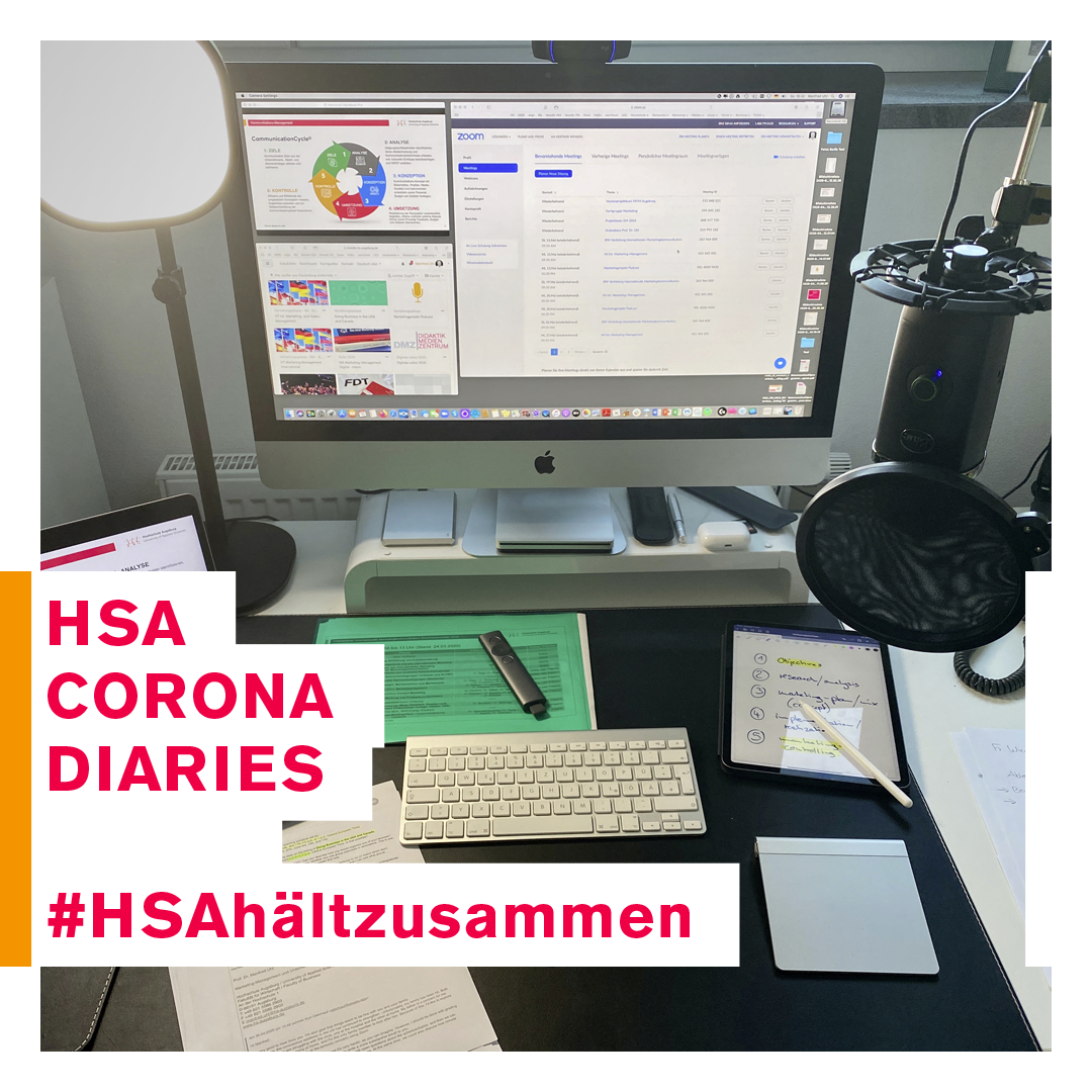 In den HSA Corona Diaries geben Studierende, Lehrende und Beschäftigte unserer Hochschule Einblicke in ihren neuen Alltag: Studierende zeigen, wie sie Veranstaltungen der digitalen Lehre von zuhause aus verfolgen oder wie sie den Arbeitsplatz in der Bibliothek gegen den Schreibtisch im WG-Zimmer oder Studentenwohnheim eingetauscht haben. Beschäftigten stellen ihren Homeoffice-Arbeitsplatz vor oder erzählen in einem Bild, wie sie ihrer Tätigkeit im Notbetrieb an der Hochschule unter den neuen Bedingungen nachgehen. Auch studentische Initiativen, die ihre Aktivitäten online durchführen, und Lehrende, die Vorlesungen und Seminare der digitalen Lehre vorbereiten, sind bei den HSA Corona Diaries dabei.