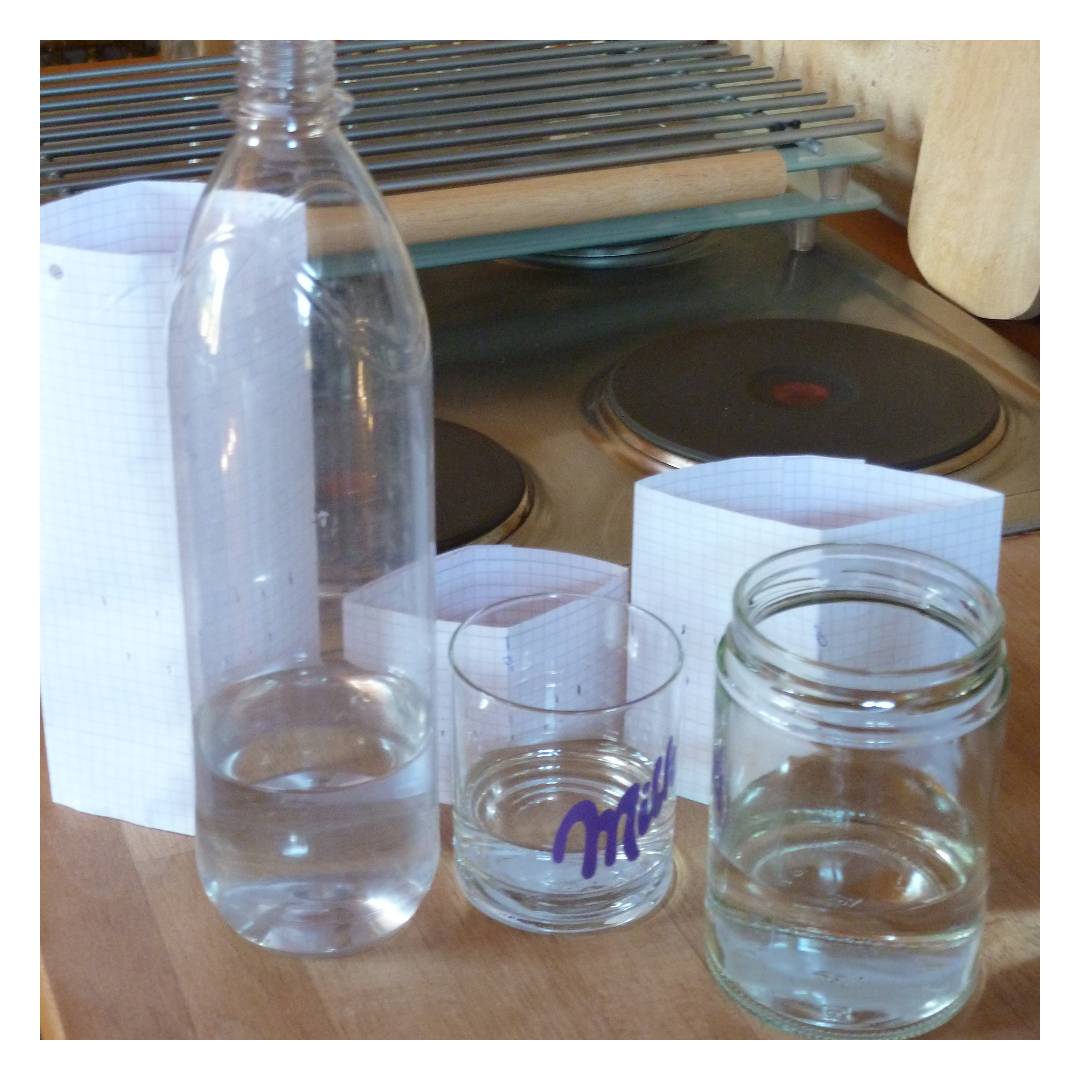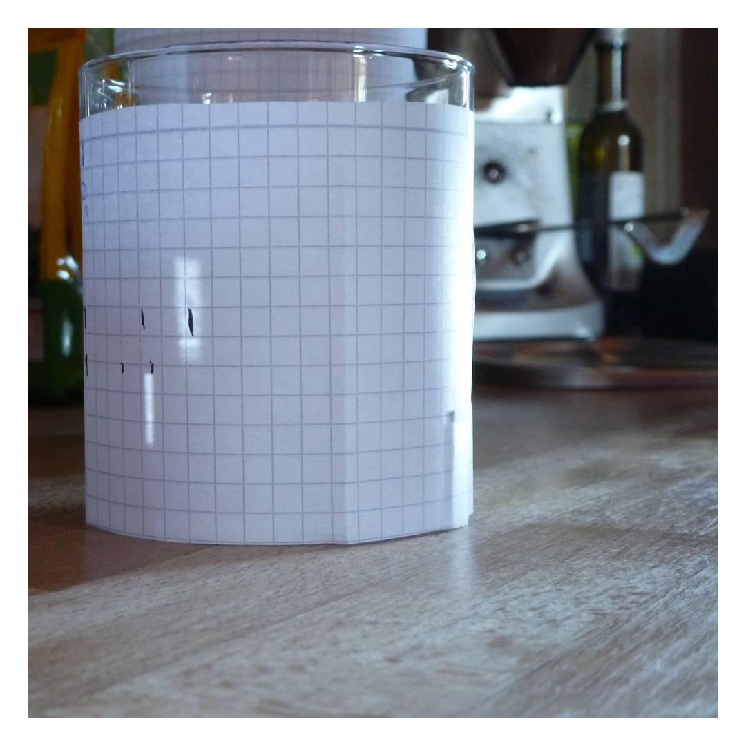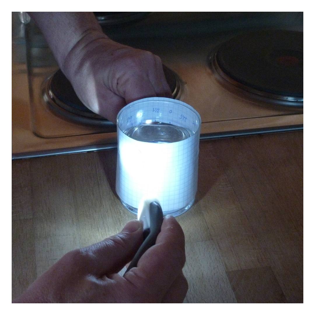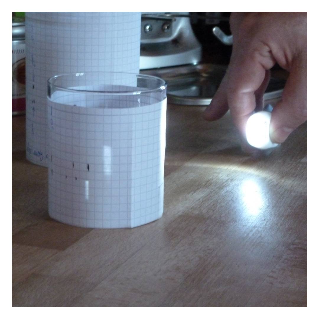 Um den Brechungsindex von Wasser 💦 und Öl zu untersuchen, wurde ein Gefäß soweit gefüllt, dass man durch den Schlitz in der Papierbanderole den Wasser- bzw. Ölstand beobachten konnte. Die Lichtquelle wurde so positioniert, dass das Licht durch den Schlitz fällt und auf der Rückseite die beiden Lichtwege durch das Wasser (unterer Fleck) und durch die Luft (oberer Fleck) beobachtbar sind.