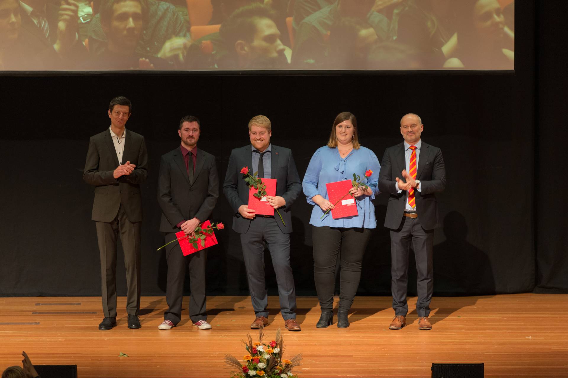 Ihre Urkunden durften bei der feierlichen Verabschiedung im Kongress am Park auch Benjamin Wenzel, Tamara Kartheininger und Julian Wazulek in Empfang nehmen. Alle drei waren Mitglieder der Studierendenvertretung gewesen und hatten sich in den vergangenen Jahren neben ihrem Studium in außerordentlichem Maße für die Studierendenschaft der Hochschule eingesetzt. So hatten sie Veranstaltungen organisiert und die Interessen der Studierenden in den hochschulpolitischen Gremien vertreten.