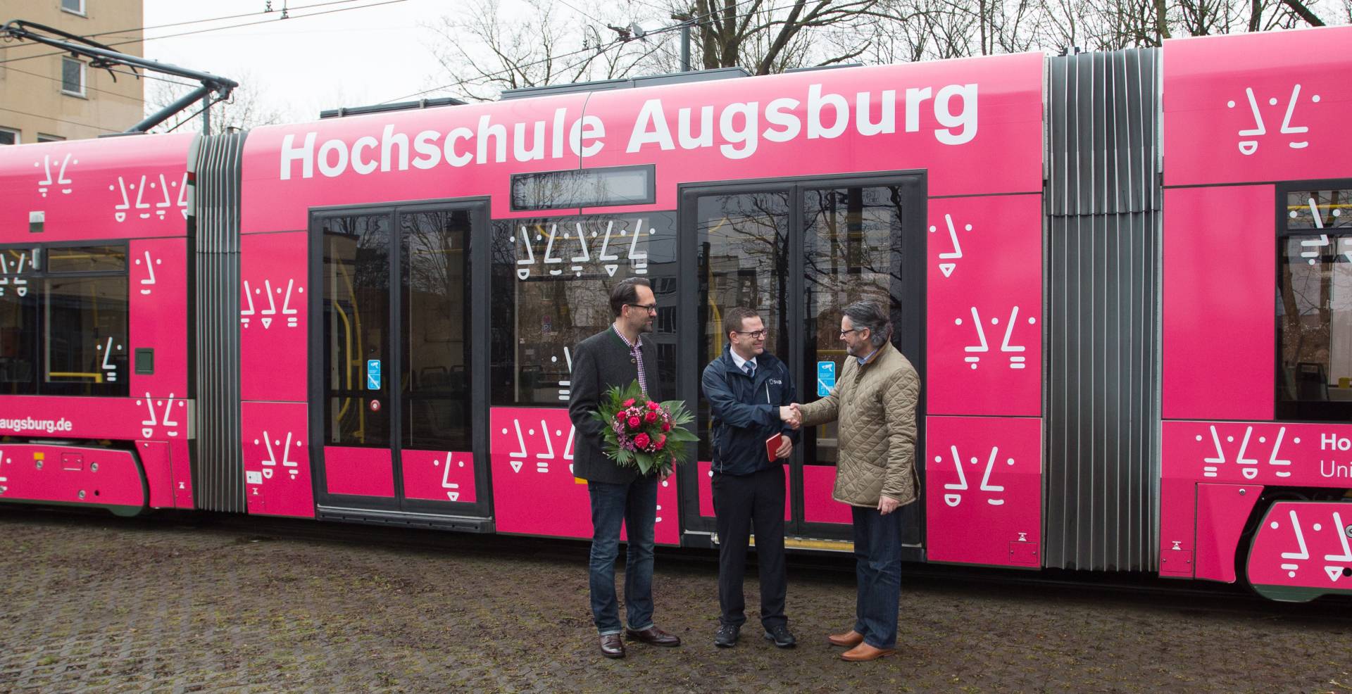 Und damit wir auch dauerhaft im Stadtbild präsent sind, haben wir eine Straßenbahn im Hochschul-Design bekleben lassen – ein echter Hingucker. Diese wurde nun offiziell übergeben und ist auf unterschiedlichen Linien in Augsburg im Einsatz.