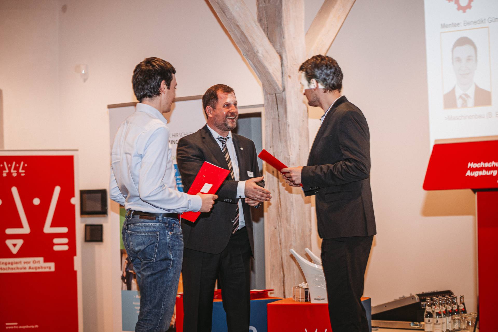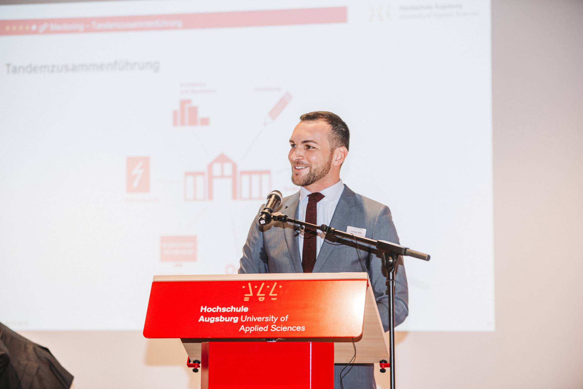 Bei der Veranstaltung im Wittelsbacher Schloss führten die Programmleiter Robert Dölle und Christian Glaser Mentees und Mentoren zusammen, die sie zuvor nach fachlichen Kriterien einander zugeteilt hatten. Zugleich verabschiedeten sie auch die Teilnehmer des ersten Jahrgangs des Mentoring-Programms. Sowohl Mentees als auch Mentoren zogen ein positives Fazit. „Die Anmeldezahlen und das Feedback der Teilnehmer zeigen, dass ein fakultätsübergreifend angelegtes Mentoring-Programm der richtige Schritt der Hochschule Augsburg war, um unseren Beitrag zur Fachkräftesicherung in der Region weiter auszubauen“, so Robert Dölle.