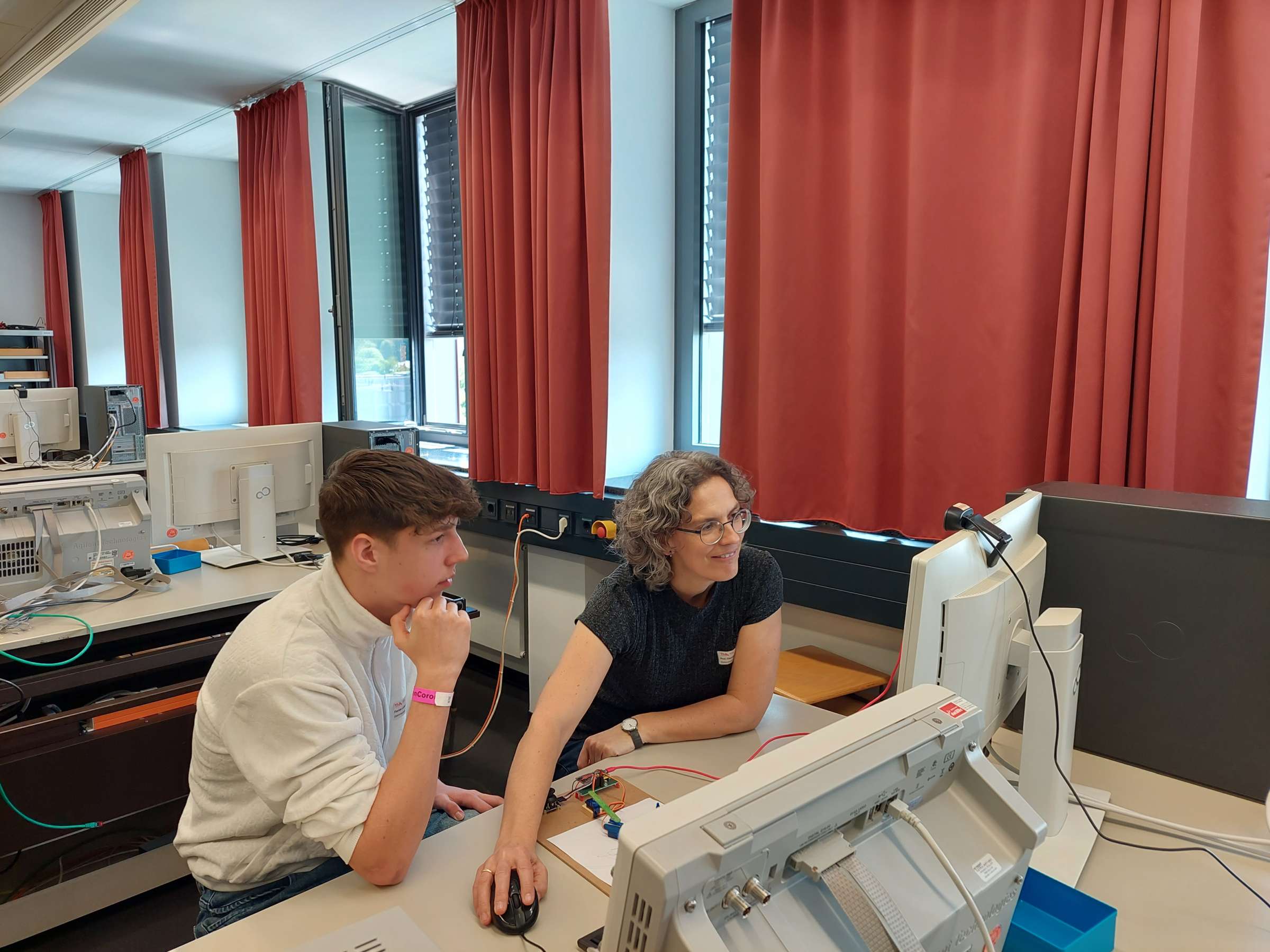 In der Fakultät für Maschinenbau und Verfahrenstechnik drehte sich alles um das Thema Bewegung und Steuerung von Maschinen: Die Teilnehmenden hatten die Gelegenheit, die faszinierende Welt der Robotik hautnah zu erleben und selbst Hand anzulegen. Prof. Matthias Kurze brachte ihnen die Grundlagen der Regelungstechnik näher und erklärte anschaulich, wie Maschinen und Roboter durch den Einsatz fortschrittlicher Regelungssysteme autonom navigieren können. Diese Systeme ermöglichen es den Maschinen, ihre Umgebung zu erkennen, darauf zu reagieren und sich entsprechend zu bewegen. Im Anschluss ging es in das Robotik-Labor: Unter der Anleitung von Laboringenieurin Lilia Jasnov lernten die Studieninteressierten, wie sie Bewegungsabläufe für Roboter programmieren und optimieren können und entwickelten ein Verständnis für die komplexen Abläufe hinter der Bewegung von Maschinen. Nach der Theorie folgte die Praxis: Das neu erworbene Wissen wurde gleich angewendet und der Roboter selbst gesteuert.