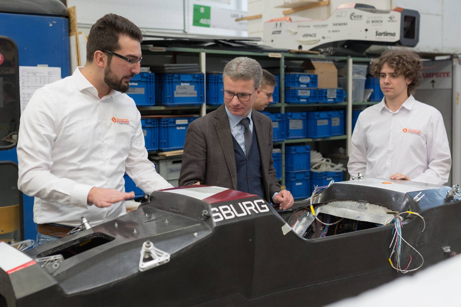 Das Rennteam der Hochschule Augsburg konnte bei den Formula Student Wettbewerben im Sommer 2019 Glanzleistungen zeigen. Damit zog es die Aufmerksamkeit des bayerischen Ministeriums für Wissenschaft und Kunst auf sich. Am vergangenen Donnerstag besuchte Wissenschaftsminister Sibler zusammen mit Andreas Jäckel, Mitglied des bayerischen Landtags, die Werkstatt des StarkStrom Augsburg e.V.
