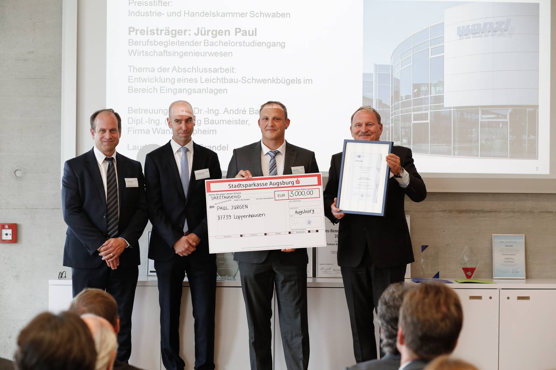 Mit dem Preis der Schwäbischen Wirtschaft bedachte die Industrie- und Handelskammer Schwaben Jürgen Paul, Absolvent im berufsbegleitenden Bachelorstudiengang Wirtschaftsingenieurwesen. In seiner Abschlussarbeit widmete er sich der Entwicklung eines Leichtbau-Schwenkbügels im Bereich Eingangsanlagen. Dabei wurde er seitens der Hochschule Augsburg von Prof. Dr.-Ing. André Baeten und seitens der Firma Wanzl in Leipheim von Dipl.-Ing. (FH) Jörg Baumeister betreut. Den Preis der Schwäbischen Wirtschaft überreichte Michael Grandel, Vizepräsident der IHK-Regionalversammlung Augsburg Stadt.