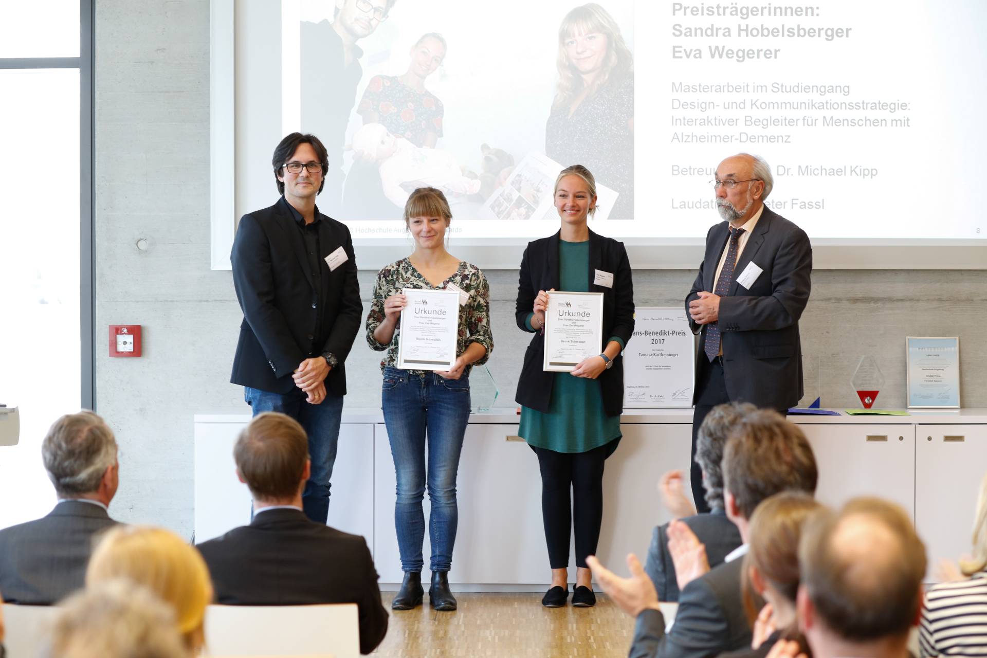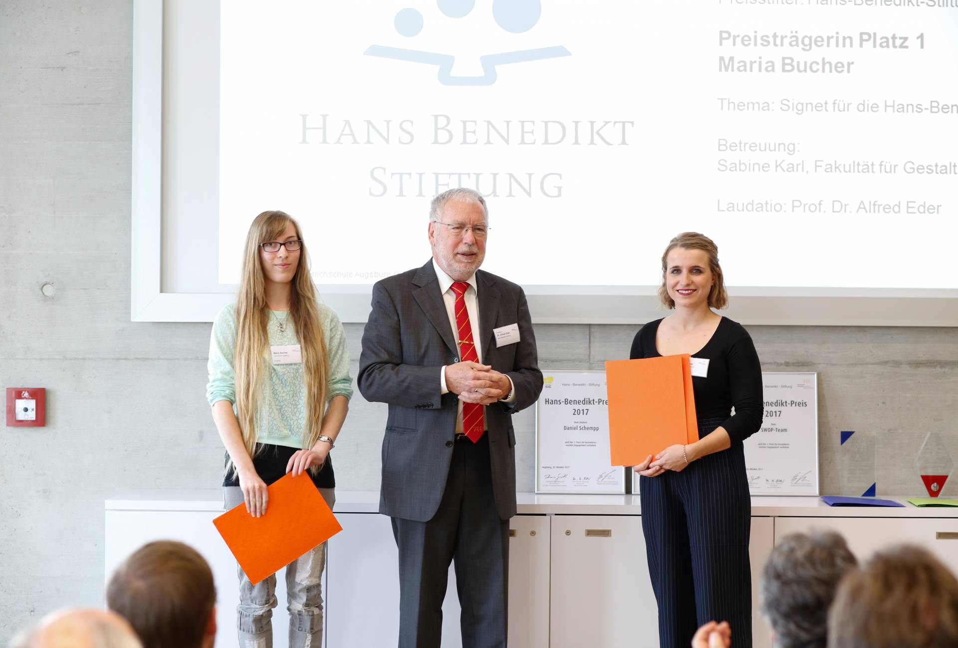 Die beiden Studentinnen Maria Bucher (Platz 1) und Janina Ebner (Platz 2 und 3) erhielten aus der Hand von Prof. Dr. Alfred Eder einen Sonderpreis für die Gestaltung eines neuen Signets der Hans-Benedikt-Stiftung. Im Rahmen einer Studienarbeit im dritten Semester des Bachelorstudiengangs Kommunikationsdesign hatten die Studierenden im Wintersemester 2016/17 Entwürfe für ein Signet erarbeitet. Das Projekt war von Sabine Karl betreut worden, Lehrbeauftragte an der Fakultät für Gestaltung der Hochschule Augsburg.