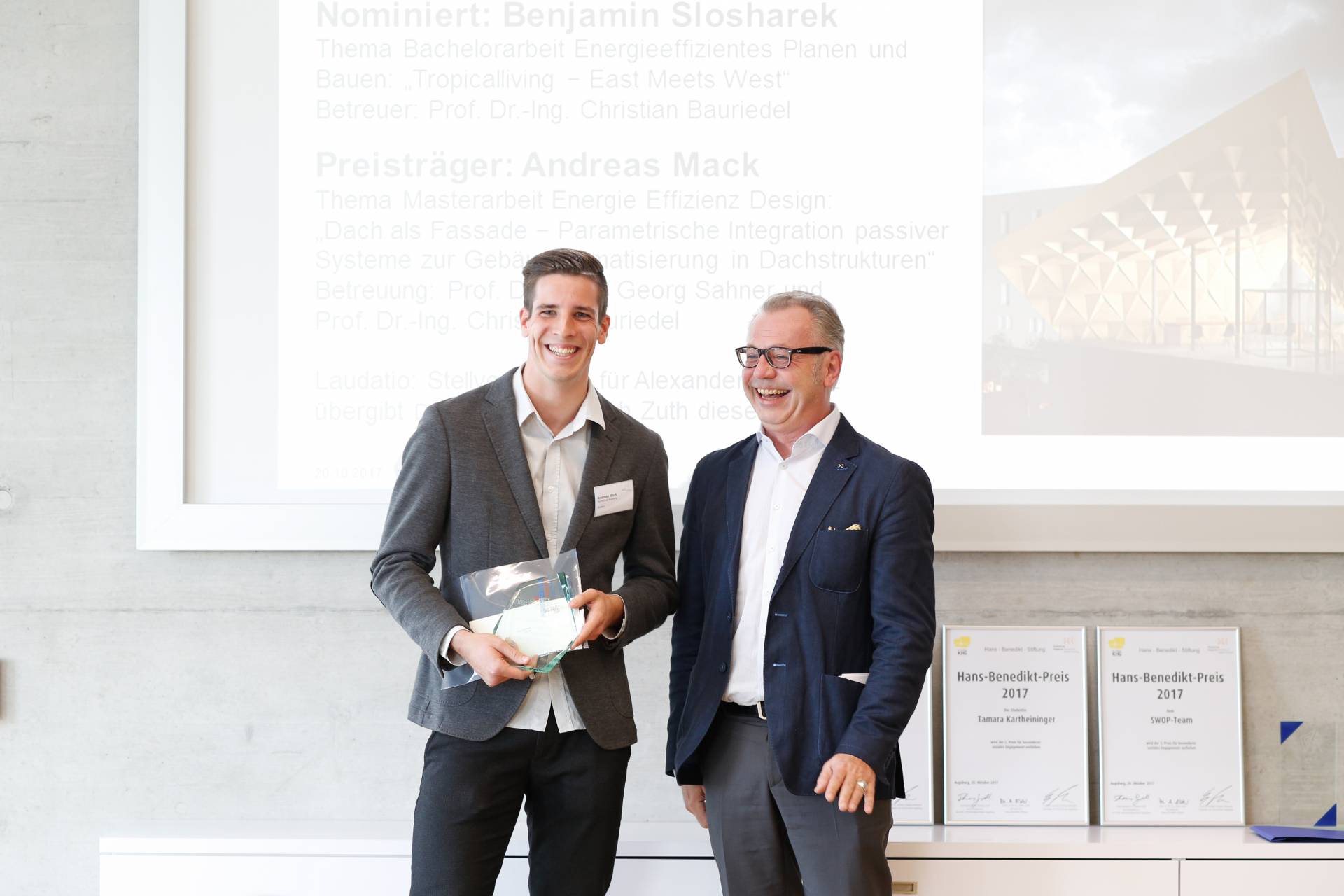 Auch die Adam Keller Baugeschäft GmbH & Co KG hatte 2017 wieder einen Studierendenpreis ausgeschrieben. Prämiert wird Andreas Mack, Masterstudent im Studiengang Energie Effizienz Design. Für den Preis qualifizierte er sich mit einer Projektarbeit. Im Fach „Methodik des energieeffizienten Entwerfens“ hatte der 24-jährige einen 3D.lab Entwurf einer digitalen Modellbauwerkstadt entwickelt. Bereits in dieser Arbeit hatte sich der Student aus Augsburg mit dem Thema Dachstrukturen beschäftigt. In seiner Begründung für die Juryentscheidung schrieb Bauleiter Sebastian Leupolz: „Ausschlaggebend war für uns die modulare Bauweise der Dachkonstruktion, die trotz oder auch wegen ihrer Einfachheit ein hohes gestalterisches Maß entwickelt und eine große Flexibilität für verschiedenste Anwendungen im Bestandsbau sowie auch Neubau bieten kann. Wir sehen in dieser Arbeit die Grundsätze einer modernen Architektursprache. Das Kredo van der Rohes „less is more“ ist hier in unseren Augen klar herauszulesen.“ Gleichzeitig besteche der Entwurf durch eine stark zeitgenössische Form. Nun spielen Dachstrukturen aktuell auch eine Rolle in der vor kurzem begonnenen Masterarbeit von Andreas Mack: „Dach als Fassade − Parametrische Integration passiver Systeme zur Gebäudeklimatisierung in Dachstrukturen“. Die Betreuung liegt bei Prof. Dipl.-Ing. Georg Sahner und Prof. Dr.-Ing. Christian Bauriedel. Den Adam-Keller-Preis übergab, stellvertretend für Geschäftsführer Alexander Leupolz, Michael Bernicker, zweiter Vorsitzender im Verein zur Förderung der Hochschule Augburg e.V.
