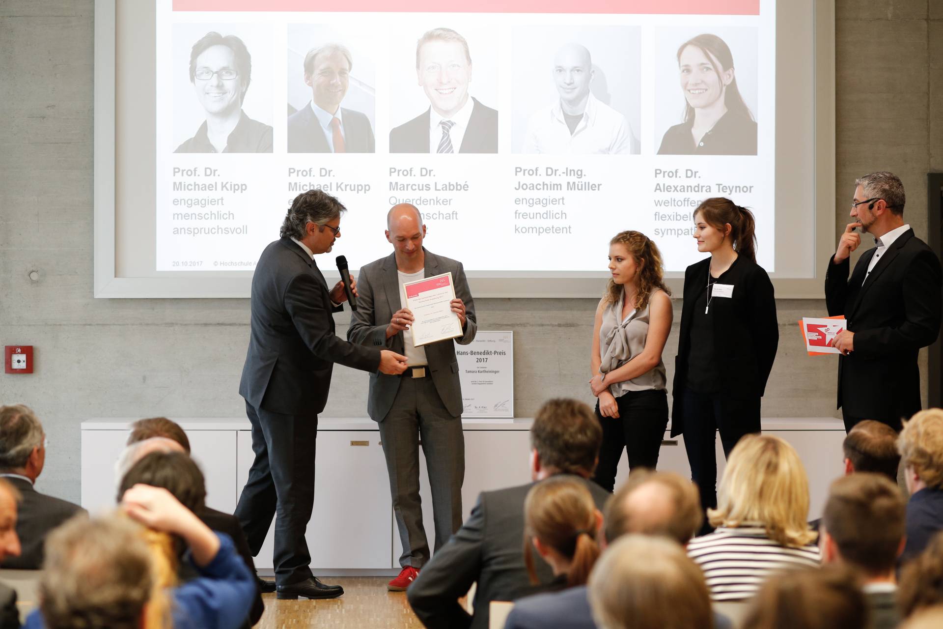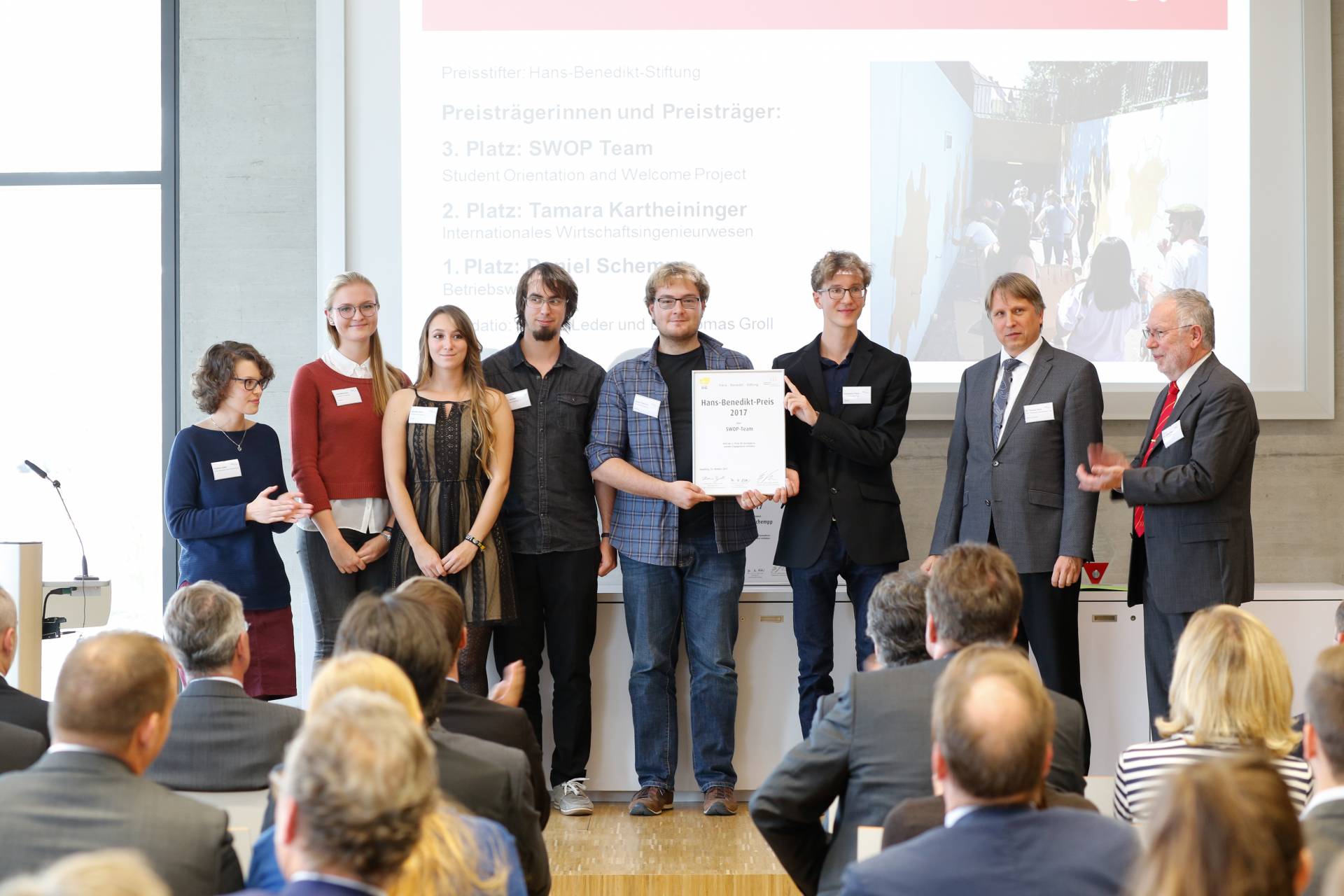 Der Hans-Benedikt-Preis ging in diesem Jahr auf dem ersten Platz an Daniel Schempp, Student der Betriebswirtschaft. Der 22-jährige unterstützt − neben seinem Studium und sonstigem Engagement − einen körperlich behinderten Studenten. „Um seine Hilfe für den jungen Mann macht er kein großes Aufheben“, so Laudator Dr. Thomas Groll. Für Schempp sei seine Hilfe eine Selbstverständlichkeit. Diese Selbstlosigkeit habe auch seinen Dekan Prof. Dr. Michael Feucht beeindruckt, so dass er ihn für den Preis vorgeschlagen hatte. Schempp ist derzeit für einen Auslandsaufenthalt in Norwegen unterwegs. Die Preise der Hans-Benedikt-Stiftung wurden durch Sophia Leder und Dr. Thomas Groll von der Katholischen Hochschulgemeinde Augsburg überreicht.