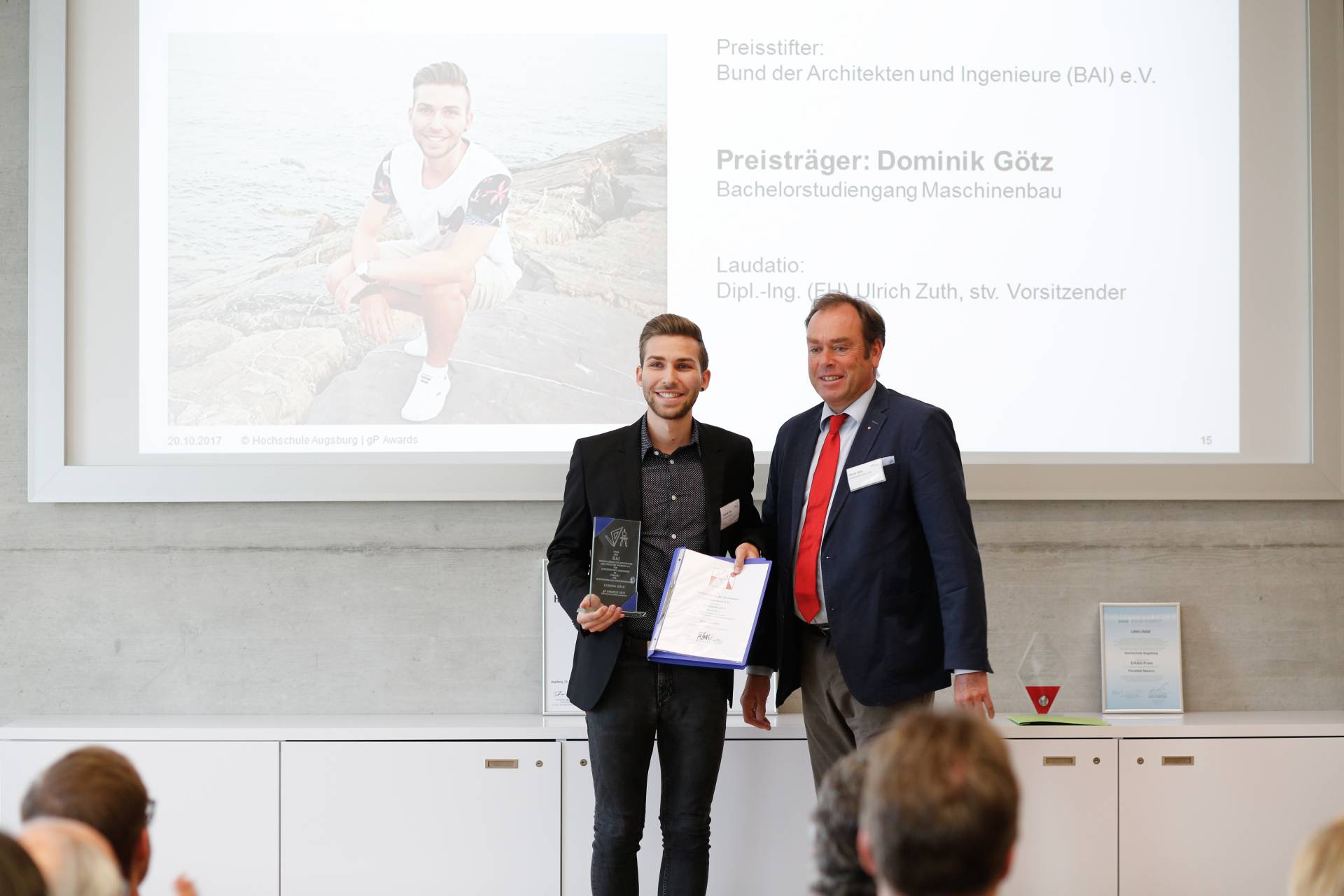 Der Preisträger des Bund der Architekten und Ingenieure e.V. (BAI) heißt im Jahr 2017 Dominik Götz. Er studiert seit 2014, jetzt im achten Semester, im Bachelorstudiengang Maschinenbau an der Hochschule Augsburg. Seine Abschlussarbeit verfasst Götz in Kooperation mit der RENK AG im Bereich Zentrale Getriebetechnik. Der Student aus Buchdorf unterstützte mehrfach als Tutor Kommilitonen aus niedrigeren Semestern bei schwierigen Aufgabenstellungen. Für seine hervorragenden Studienleistungen war der 23-jährige auch bereits durch ein Stipendium der Firma Grenzebach Maschinenbau GmbH gefördert worden. Die Auszeichnung des BAI überreichte Dipl.-Ing. (FH) Ulrich Zuth, als stellvertretender Vorsitzender des Vereins.