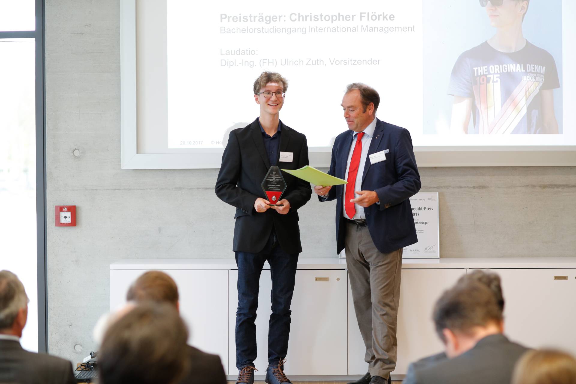 Den Preis für engagierte Studierende des Vereins zur Förderung der Hochschule Augsburg e.V. erhielt Christopher Flörke. Er studiert seit 2012 im Bachelorstudiengang International Management und ist in vielfacher Hinsicht an der Hochschule Augsburg ehrenamtlich aktiv. Unter anderem als Mitglied des SWOP Teams zur Betreuung ausländischer Studierender. Auch im Rahmen des Deutsch-Französischen Hochschulseminars „Bourges“ hatte er sich mehrfach aktiv beteiligt, sei es im Rahmen der Betreuung von französischen Gästen, der Öffentlichkeitsarbeit oder der Organisation von Aktivitäten für die deutsch-französische Gruppe. Auch im Gründernetzwerk an der Hochschule Augsburg ist Flörke sehr engagiert. Den Preis des Vereins zur Förderung der Hochschule Augsburg e.V. überreichte der Vorsitzende Dipl.-Ing. (FH) Ulrich Zuth.