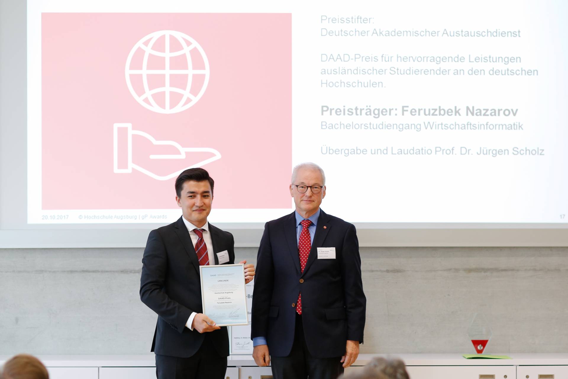 Der DAAD Preis 2017 der Hochschule Augsburg geht an Feruzbek Nazarov aus der Samarkand-Region in Usbekistan. Prof. Dr. Jürgen Scholz, Dekan der Fakultät für Informatik an der Hochschule Augsburg, sagte in seiner Laudatio: „Herr Nazarov ist einerseits ein ausgezeichneter Student der Wirtschaftsinformatik mit einem überdurchschnittlich guten Notendurchschnitt. Andererseits ist er als Tutor in verschiedenen Fächern wie Mathematik, Programmieren und Datenbanken sehr erfolgreich. Hier gibt er bereitwillig sein umfassendes Wissen an seine Kommilitonen weiter.“