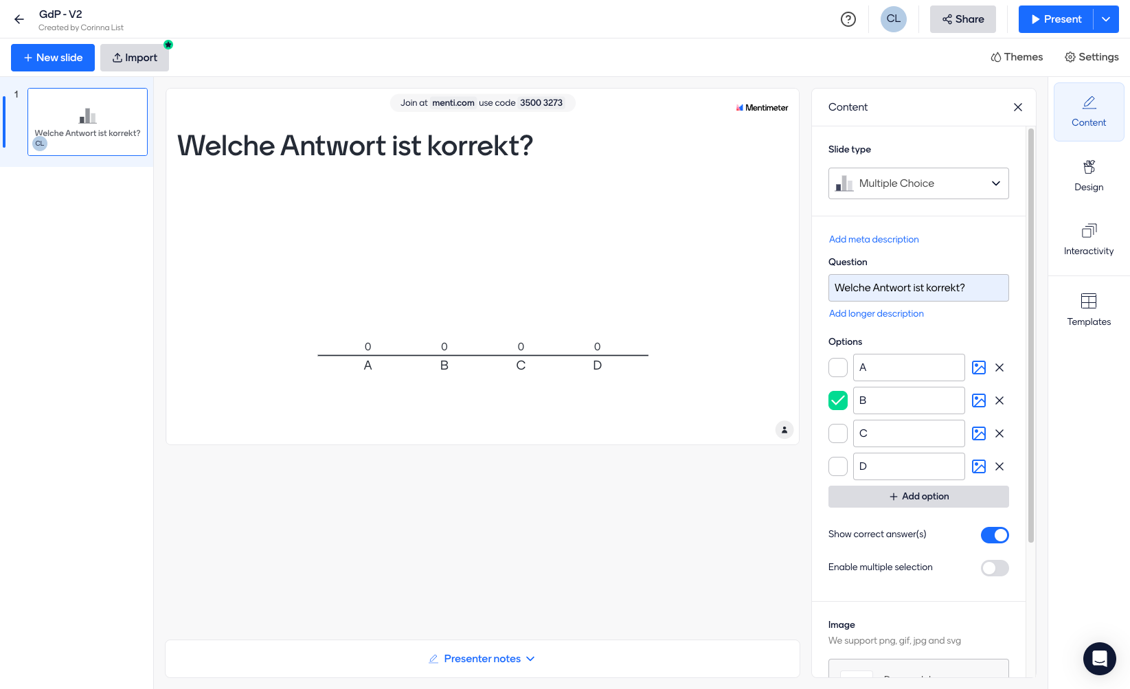 Jede Interaktion wird dabei auf einer einzelnen Folie dargestellt und ergänzt somit den Foliensatz mit den Vorlesungsinhalten. Die Möglichkeiten sind dabei vielfältig. Auch Timer, spielerische Elemente wie "Spin the Wheel" oder Miro-Boards können beispielsweise hinzugefügt werden.