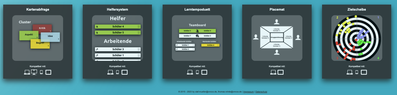 ONCOO stellt eine webbasierte Anwendung dar, die Lehrkräften spezielle Instrumente zur Verfügung stellt, um diverse kooperative Lehrmethoden interaktiv umzusetzen. Dadurch kann insbesondere die Zusammenarbeit in größeren Gruppen erleichtert werden.