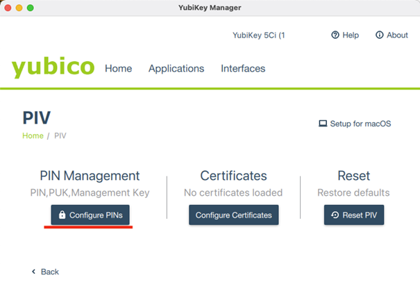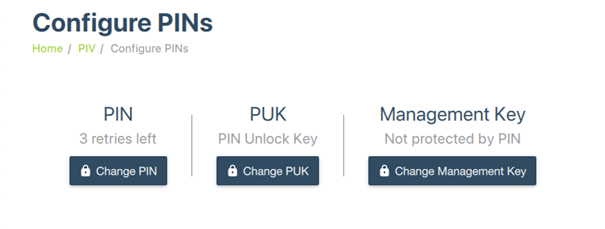 Klicken Sie im PIV Fenster auf „Configure PINs“ im Reiter PIN Management