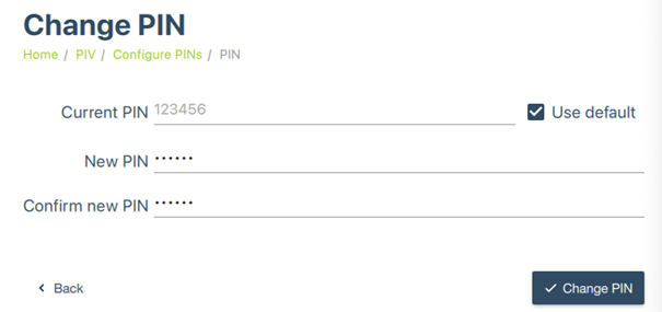 Die Schritte, um die PINs zu ändern funktioniert für alle 3 PINs gleich. Geben Sie den aktuellen PIN, PUK oder Management Key ein und tragen Sie einen neuen, eigens ausgedachten, PIN ein. Nur beim Management Key besteht die Möglichkeit sich einen Key generieren zu lassen. Klicken Sie nun auf „Change PIN“