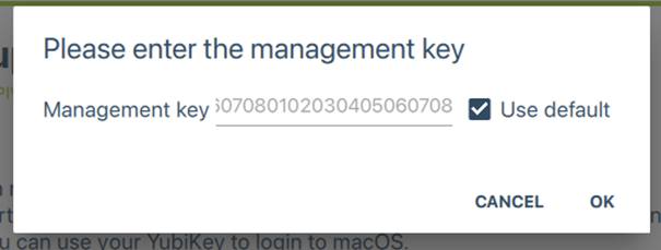 Ihr YubiKey hat ein PIN, PUK, und Management Key. Die Werkseinstellungen sind wie folgt: