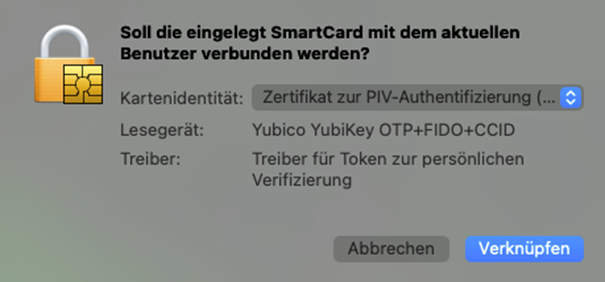 Am oberen rechten Bildschirmrand sollte nun eine SmartCard Benachrichtung erscheinen, bei der Ihnen die Verknüpfung mit dem YubiKey vorgeschlagen wird. Klicken Sie auf „Verknüpfen“.