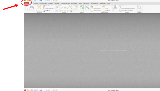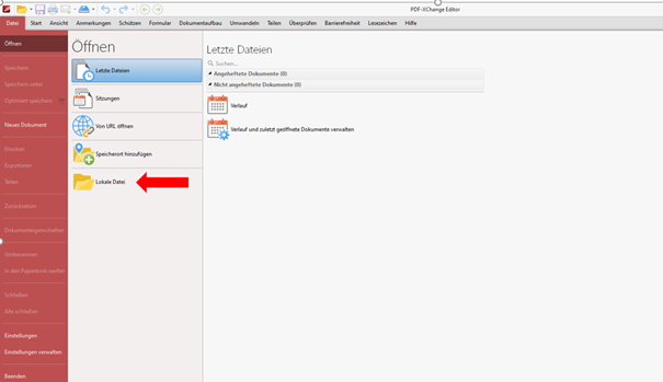 Starten Sie PDF XChange und klicken Sie auf die rote Schaltfläche DATEI (oben links) und wählen Sie die Option Öffnen-> Lokale Datei aus.