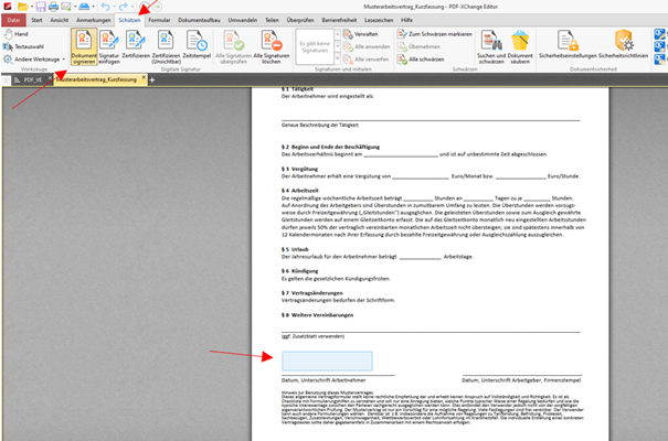 - Nachdem Sie das richtige Dokument geöffnet haben, klicken Sie auf das Tab „Schützen“ und danach auf die Option „Dokument signieren“.