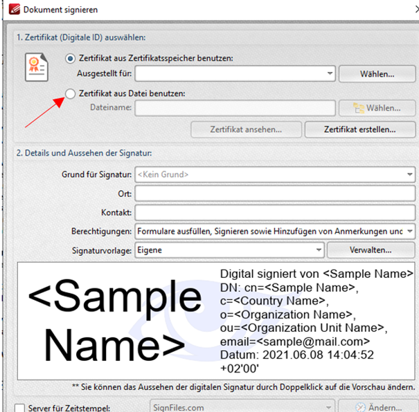 - Klicken Sie auf den Punkt Zertifikat aus Datei benutzen.