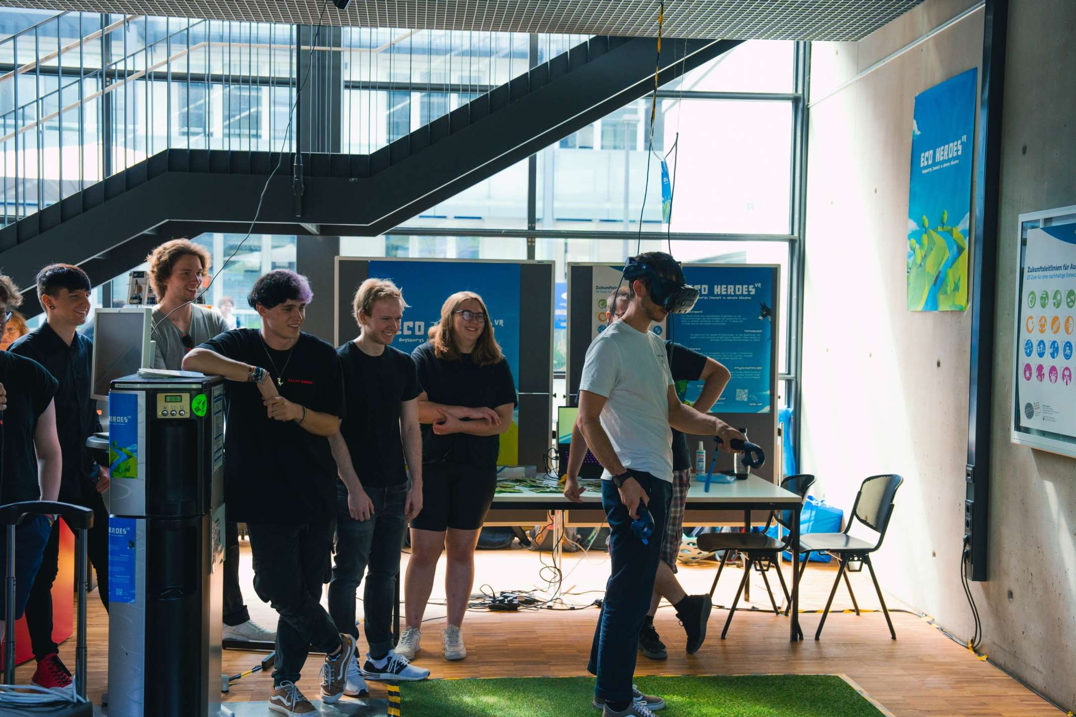 Das Ergebnis ist ein Open Source VR-Game mit Minispielen, die Schülerinnen und Schülern die Nachhaltigkeitsziele der Stadt Augsburg auf spielerische Art und Weise vermitteln sollen. Im Rahmen des Projektages 2023 der Fakultät Informatik stellte die Projektgruppe ihr Spiel vor und neugierige Besucher konnten eifrig testen. Mit ihrem VR-Projekt gewann die Gruppe den 4. Platz unter allen Projekten, die dieses Jahr angetreten waren.